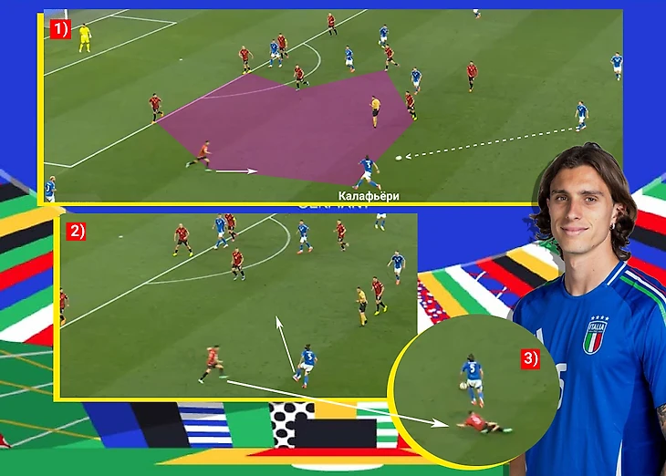 На контрасте: центральный защитник сборной Италии, видя перед собой свободную зону, принимает мяч вперед, хотя это пространство рядом со штрафной соперника, а позади страхуют только два партнера, один из которых не защитник + слева несется оппонент, готовый забрать мяч вместе с ногой. Получилось так, что Калафьёри обвел соперника одним касанием, который после подката остался позади, а мяч оказался в опасной зоне