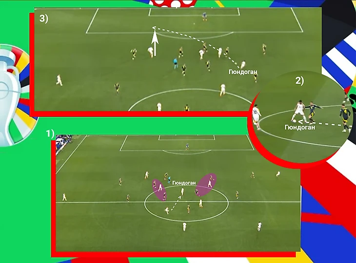 До паса Гюндогана был его отличный прием мяча с разворотом, он распорядился мячом так, что он был закрыт от соперника спиной (прием через дальнюю сторону). А до приема мяча немцем, были некоторые важные командные взаимодействия.