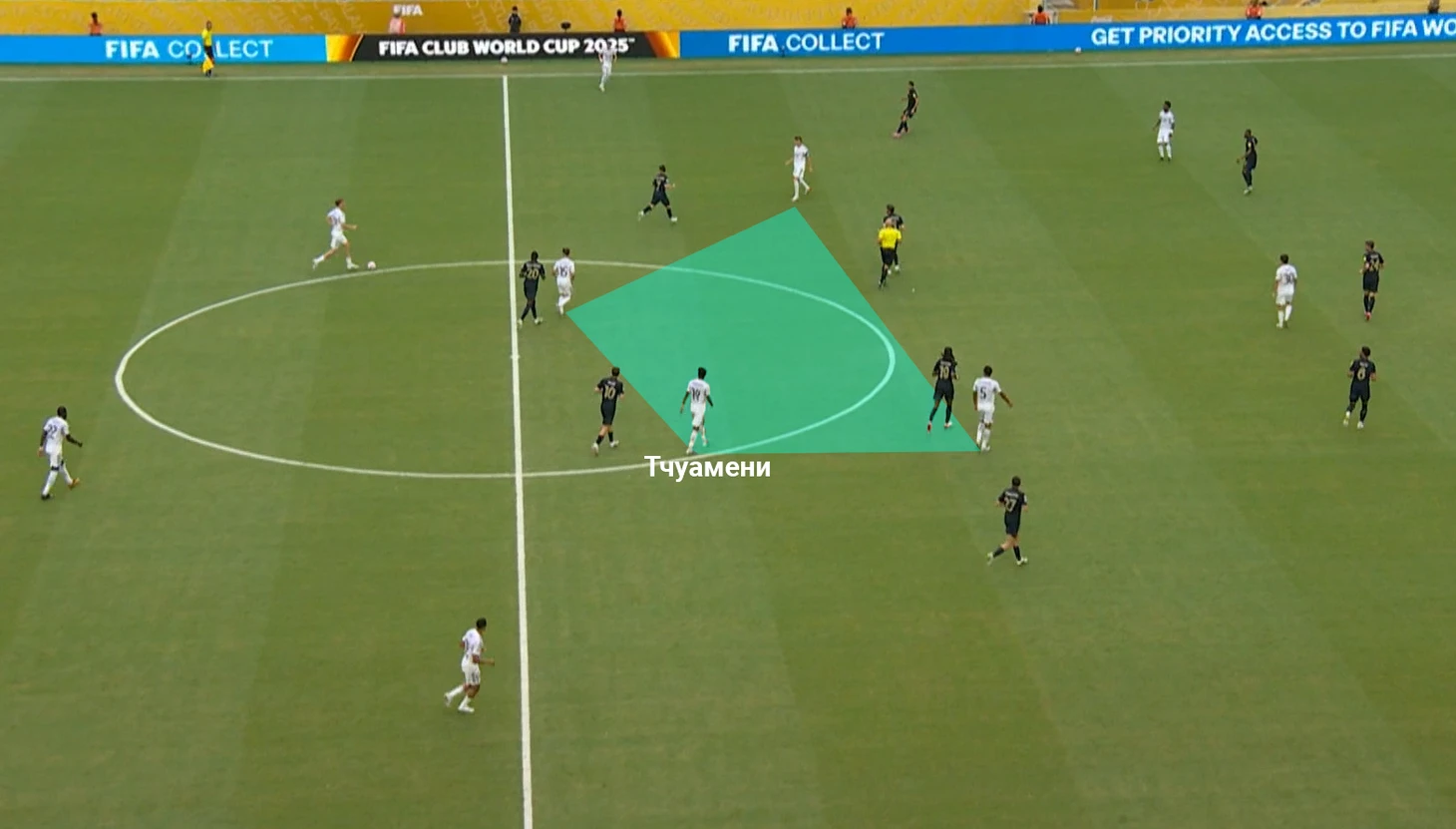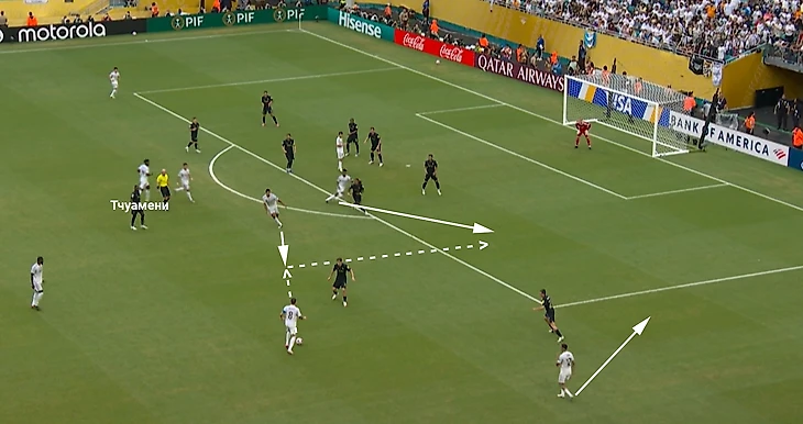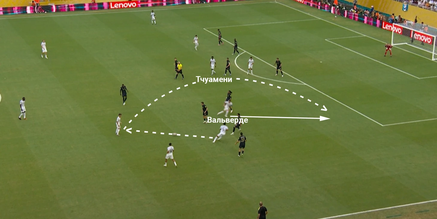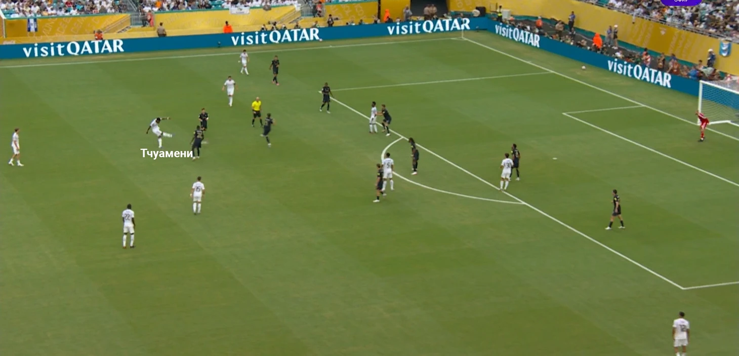 Эпизодически Тчуамени оказался вблизи в штрафной (он изначально ценральный в тройке защитников если что), как вдруг прошла очень даже симпатичная, такая «АлонсоБайеровская» даже, комбинация: