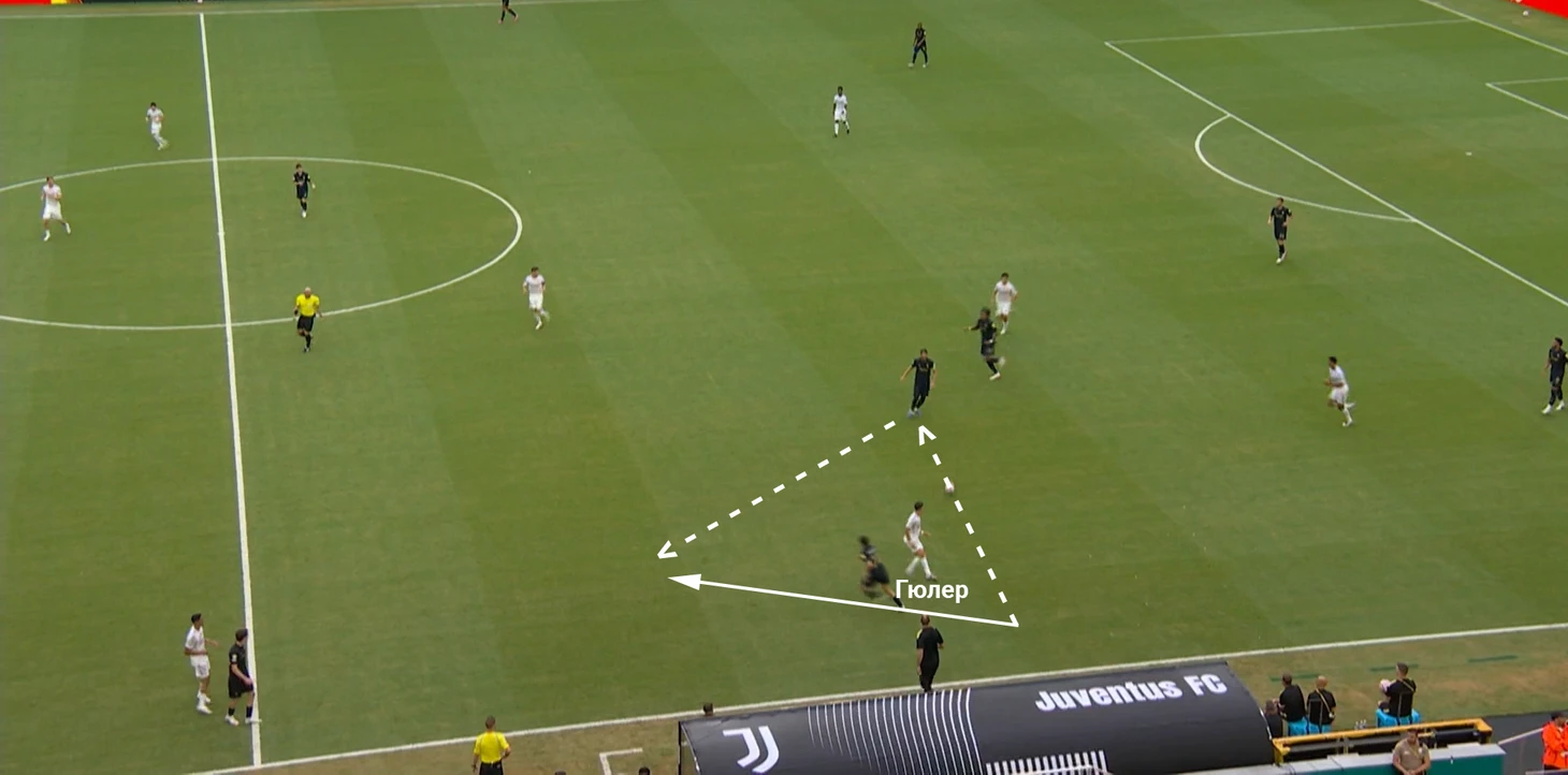 Это был сигнал для Алонсо. Орельен в позиционке теперь стал играть выше. Он не сильно участвовал в комбинациях, но заставлял игроков «Ювентуса» располагаться более уже, благодаря чему, другие игроки могли получать мяч в свободных зонах: