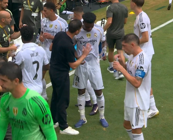 В течении игры Тчуамени постоянно получал инструкции от Хаби. После гола например получил подсказ. В перерыве также не обошлось без коррекций Алонсо: