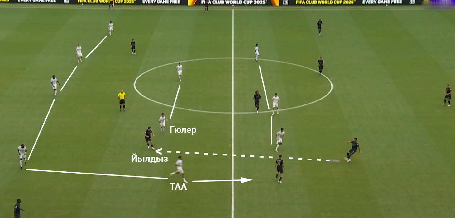 В плей-офф КЧМ Хаби Алонсо понял кое-что важное на счет правого фланга обороны «Реала» — пока команда не владеет мячом, Гюлера и Трента не стоит держать рядом. Эта парочка даже на бумаге выглядит не очень надежной. Кажется, что Йылдыз специально открывался в своем левом полуфланге (как раз между Ардой и Трентом), ведь знал, что Гюлер не достаточно цепок, поэтому он без проблем принял мяч вполоборота, дошел до полукруга и опасно пробил по воротам