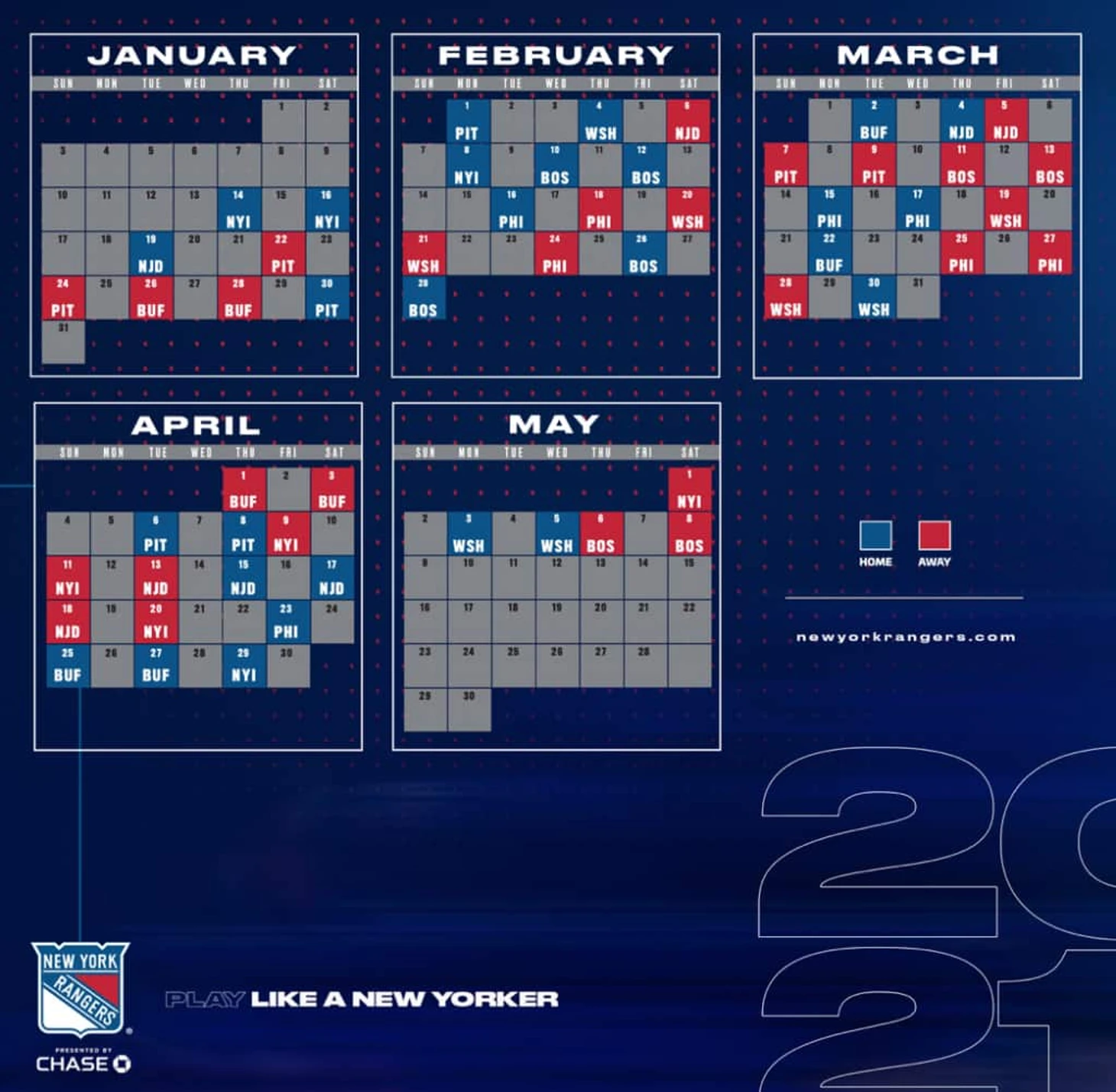 Всех с новым 2021м годом. Я надеюсь у всех он будет по-лучше чем предыдущий. По крайней мере оптимизм должен преобладать. Повсеместно начались вакцинации и наконец в северной америке появился хоккей. В Эдмонтоне в завершающей стадии находится МЧМ, в штатах потихоньку продолжается коллегиальный хоккей, а так же начались местами детские игры. Пора пора. 13 января начинается большой хоккей, Рейнджерс откроют сезон 14го января дома с Айлс. А вот и весь календарь игр: