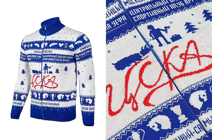 UPD: Мы пропустили, что мужик на свитере ЦСКА еще и справляет нужду на обезглавленную свинью. Это уж какой-то треш и явный перебор.