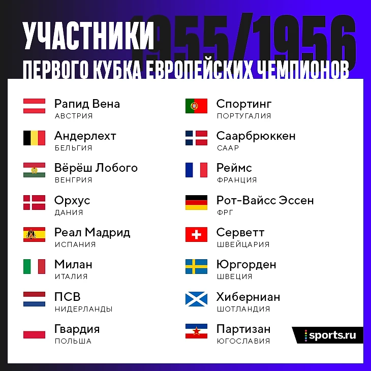 Первый Кубок европейских чемпионов прошел в сезоне-1955/56, его состав определяла редакция L’Equipe. В первоначальном списке было 18 клубов, но некоторые отказались. Например, «Челси» – из-за рекомендации Футбольной ассоциации Англии, там считали, что команда отвлечется от внутренних дел.