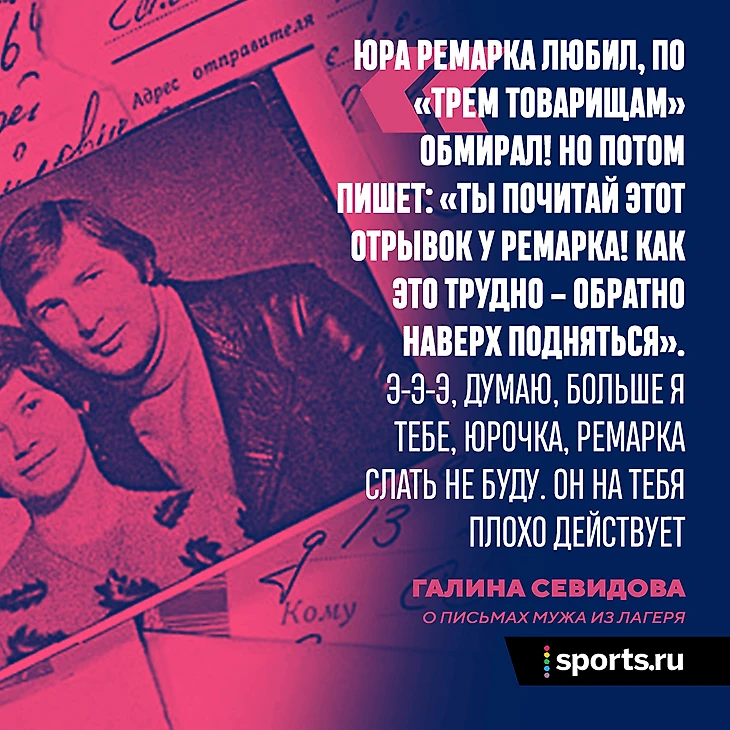 Комментарий Галины: «Я футболом заинтересовалась из-за него. Писала ему, кто как сыграл. Но не очень-то расписывала: это цепляло его за сердце. Он там футбол видеть не мог. И футбол ему снился. A потом он в Вятлаге играл. В выходные. Сан Саныч ему из Минска мячи присылал. Юра Ремарка любил, по «Трем товарищам» обмирал! Но потом пишет: «Ты почитай этот отрывок у Ремарка! Как это трудно – обратно наверх подняться». Э-э-э, думаю, больше я тебе, Юрочка, Ремарка слать не буду. Он на тебя плохо действует».