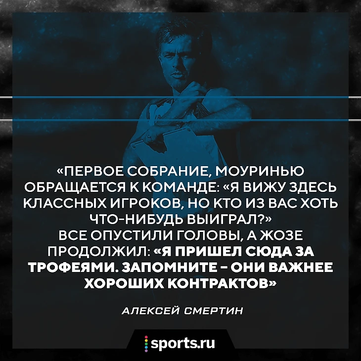 – Моуринью пришел в клуб из «Порту», с которым выиграл Лигу чемпионов. Первое собрание, он обращается к команде: «Я вижу здесь классных футболистов, но кто из вас хоть что-нибудь выиграл?» Все опустили головы. Жозе выдержал паузу и продолжил: «Я пришел сюда за трофеями. Запомните – они важнее хороших контрактов».