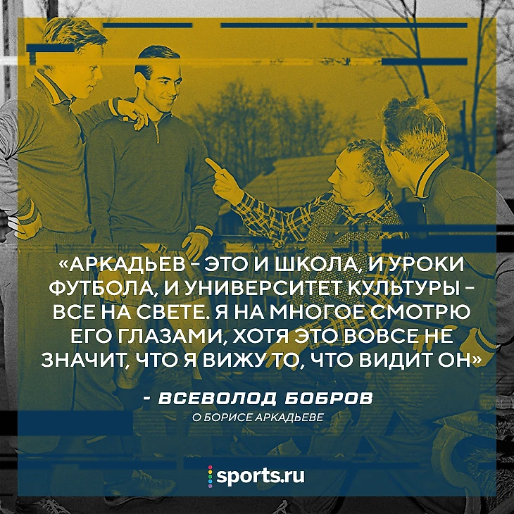 «Я не представляю своей жизни без него, – отмечал Всеволод Бобров, которого Аркадьев тренировал в ЦДКА. – Он для меня не просто тренер, и даже слово «наставник» не вмещает всего того, что значит для меня Аркадьев. Это и школа, и уроки футбола, и университет культуры – все на свете… Я на многое смотрю глазами Бориса Андреевича, хотя это вовсе не значит, что я вижу все то, что видит он».