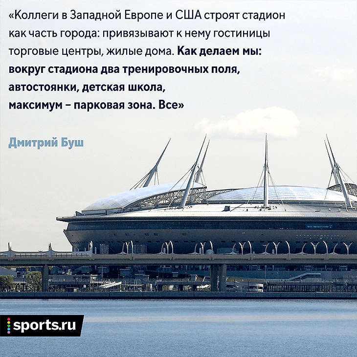 – Есть, мы часто общаемся с иностранными коллегами, видим все тенденции. Наверное, до нас не добралось главное – в Штатах и Европе никто не строит отдельный стадион. Как мы делаем: вокруг стадиона строим два тренировочных поля, автостоянки, детскую школу, максимум – парковую зону. Все.