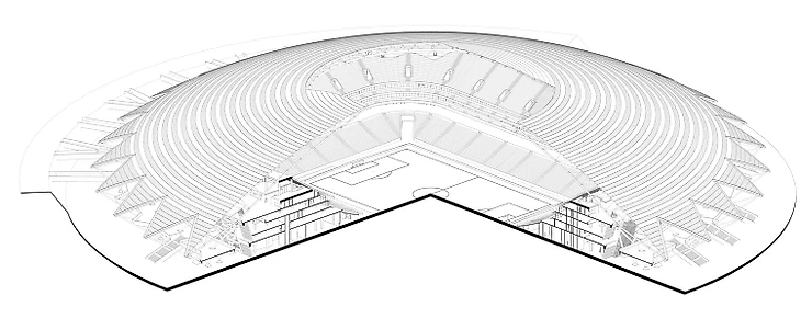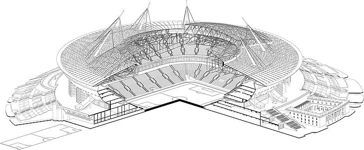 Кроме стадиона и парковок надо было разместить большое количество офисных и гостиничных помещений. Это привело к смешению жанров в одном объеме, что довольно сложно для решения задач по разведению потоков: пешеходов, зрителей, посетителей офисов, гостиниц. А еще машин, которые ездят туда-сюда. И все не должны пересекаться, не мешать друг другу.