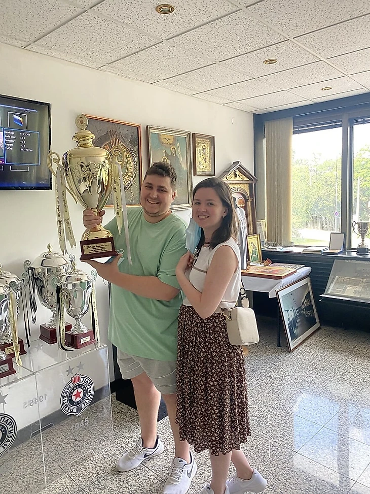 В Белграде мы съездили на стадион «Црвены Звезды», хотели попасть в музей, но он был закрыт. Поехали на стадион «Партизана», вошли в первую попавшуюся дверь, и нас встретил какой-то дед. Мы общались с ним по-английски, а когда он понял, что мы русские, наехал: «Надо было сразу по-русски». Дед предложил: «300 динар с человека (это где-то 250 рублей) – и я проведу вас на стадион и устрою экскурсию». Не обманул: провел в чашу, а в музее заставил подержаться за каждый кубок, с каждым сфотографироваться, поднять некоторые над головой. Забрал телефон Марины и наснимал кучу видосов.