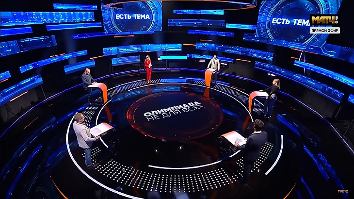 Нагнетающая музыка в заставке, круглая студия, в центре – анимация, похожая на лаву. Ведущая Мария Орзул зловеще подводит к видеосюжету: «Как вакцина от ковида стала рычагом давления в современном спорте и настоящим яблоком раздора России и Запада». Сюжет начинается еще тревожнее: «Война вакцин не объявлена, но уже идет!».