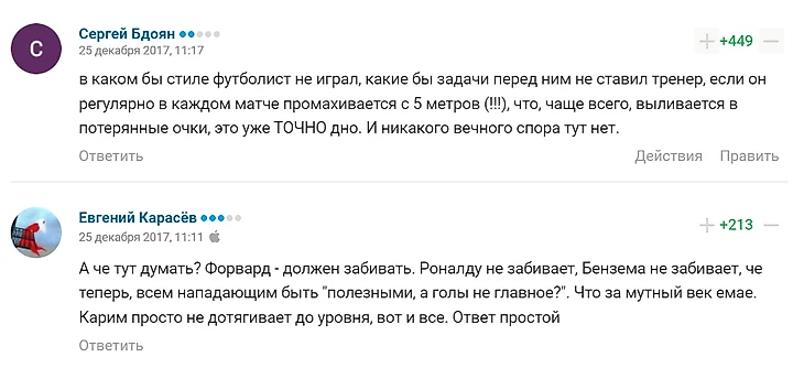 Мне кажется, дело не в уровне понимания игры, хотя я эту фразу использовал, а в уровне аргументации и радикальных выводах. Учитывая, что случай с Бензема настолько яркий и что в комментариях буквально называли его бревном, то можно употребить фразу «А я еще и футбол лучше некоторых понимаю». Но это необязательная фраза. Обязательны два аспекта: минимум категоричности, особенно если у тебя нет оснований считать себя экспертом (я и сам себя особо не считаю экспертом), и уровень аргументации. Взвешенная позиция всегда дает преимущество.