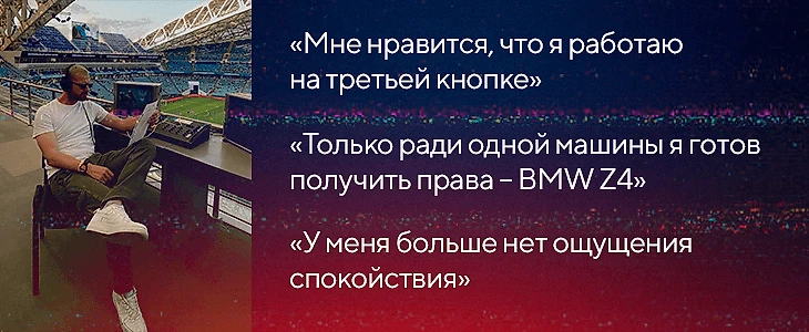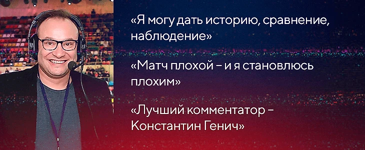 Комментатор – это не только профессия. Это тот, кто ты есть. Если ты такой же в эфире, как и в жизни, значит, ты сложился. Тебе будет проще работать, проще себя презентовать большой аудитории. Пока ты не сложился как личность, пока не набил шишек, пока не узнал, что такое тяжелый труд на пути к чему-то важному, ты не будешь комментатором.