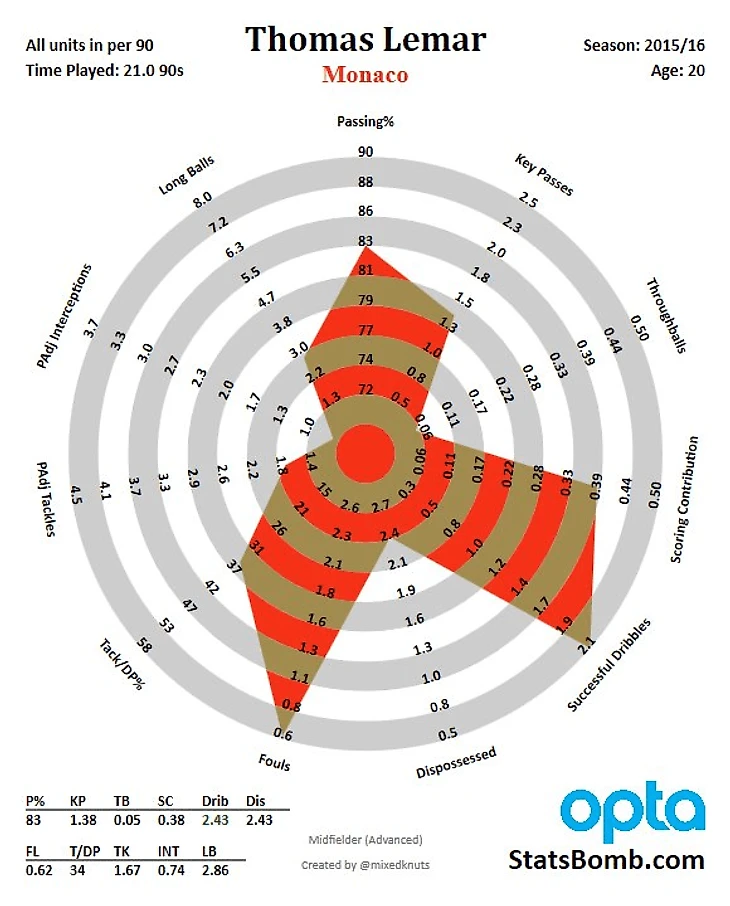 Лемар представляется универсальным игроком штучного масштаба: у него есть прекрасные скорость и ускорение, чтобы играть вингера, а его дриблерские умения заманчиво использовать в центре поля. Это его статистические показатели за последние 2 сезона: