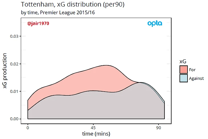 Изменения в лучшую сторону видны из следующих двух диаграмм: если в сезоне 2015-2016 созданный и допущенный xG сравнивались в районе 70 минуты, т.е. в важнейший отрезок матча, то в этом сезоне шпоры смогли побороть прошлогоднюю тенденцию, и диаграмма 2 выглядит как прекрасная работа над ошибками.