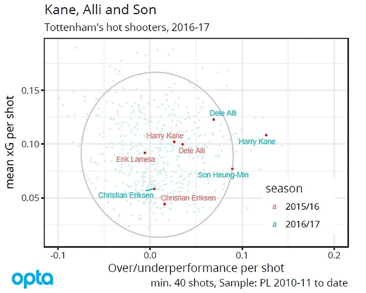 Глядя на эту диаграмму, можно сделать вывод, что и Алли, и Кейн, и Сон повысили свои показатели xGperShot по сравнению с прошлым сезоном.