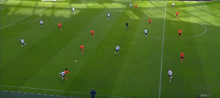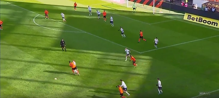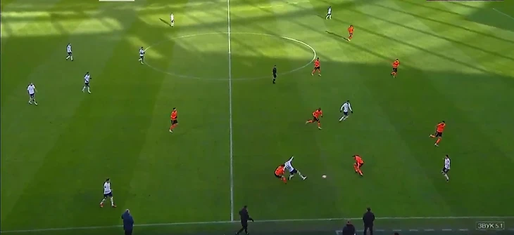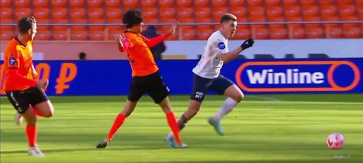 Бегич на 7-й минуте, срывая атаку, хватает руками и роняет убегающего Орозко – штрафной от Кукуяна без желтой карточки.