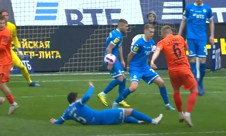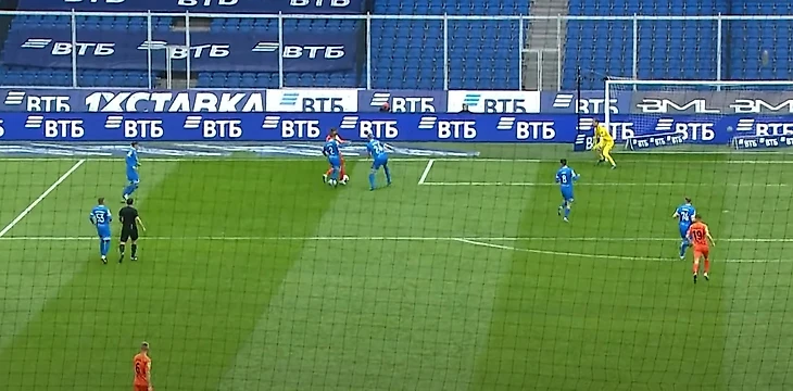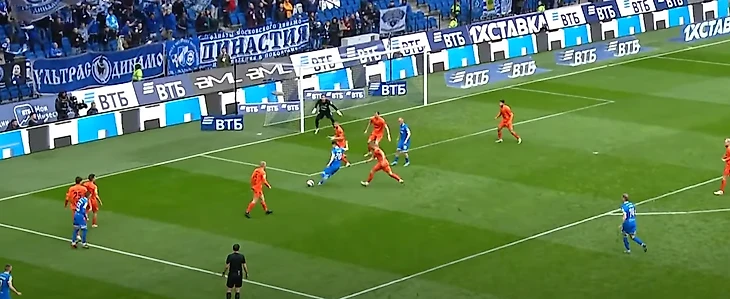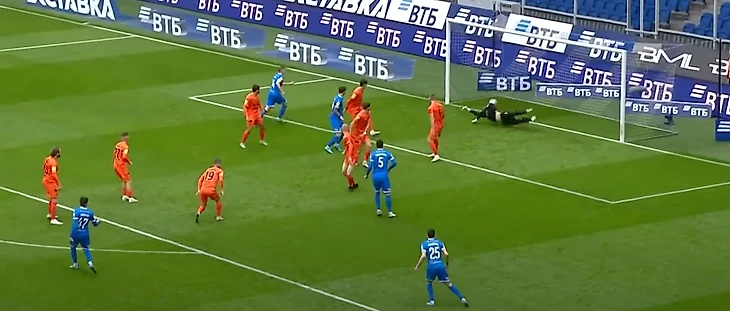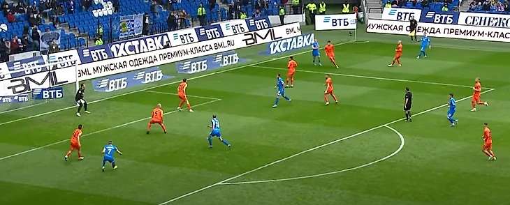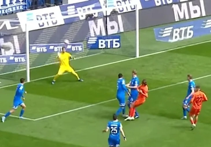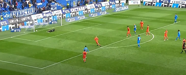 Но «Динамо», все же имело моменты. Так например на изображении, показана типичная атака хозяев путем заброса мяча с фланга. Соперник москвичей играл осторожно, опускаясь практически всей командой в штрафную, таким образом 3-ое атакующий игроков «Динамо» практически не имели шансов на забитый гол, максимум на что могло рассчитывать «Динамо» - это сейв Помазуна или угловой.
