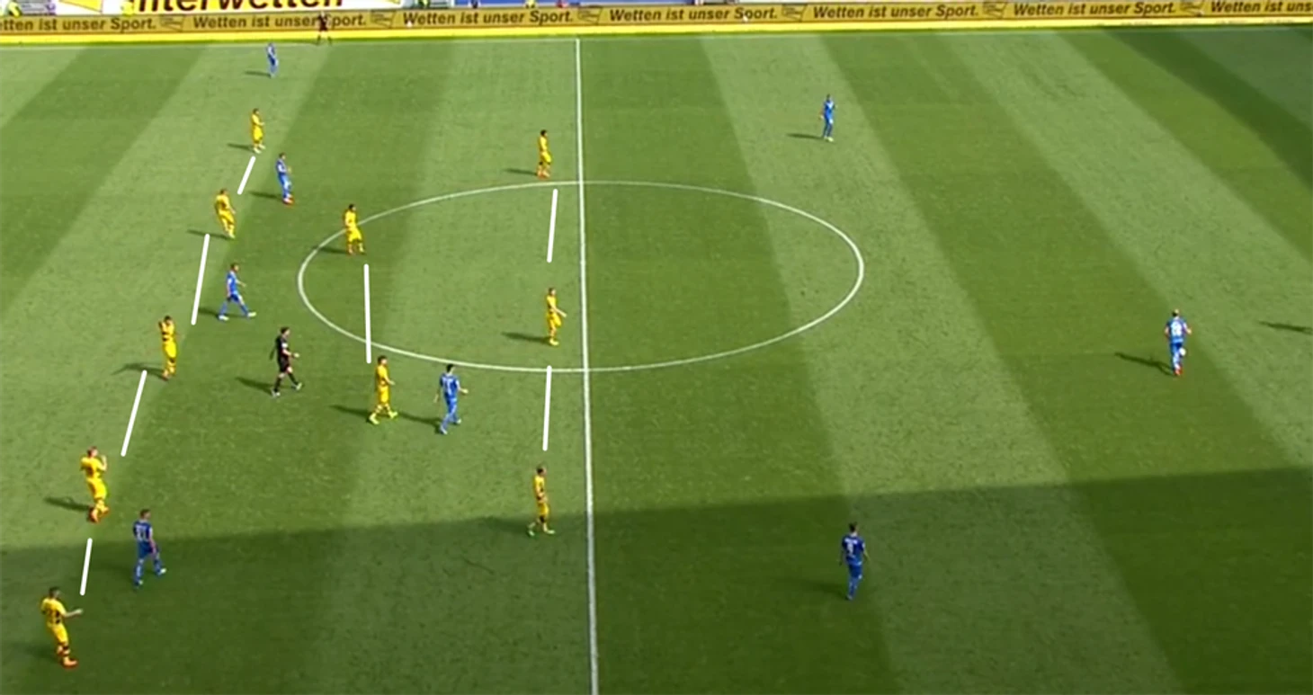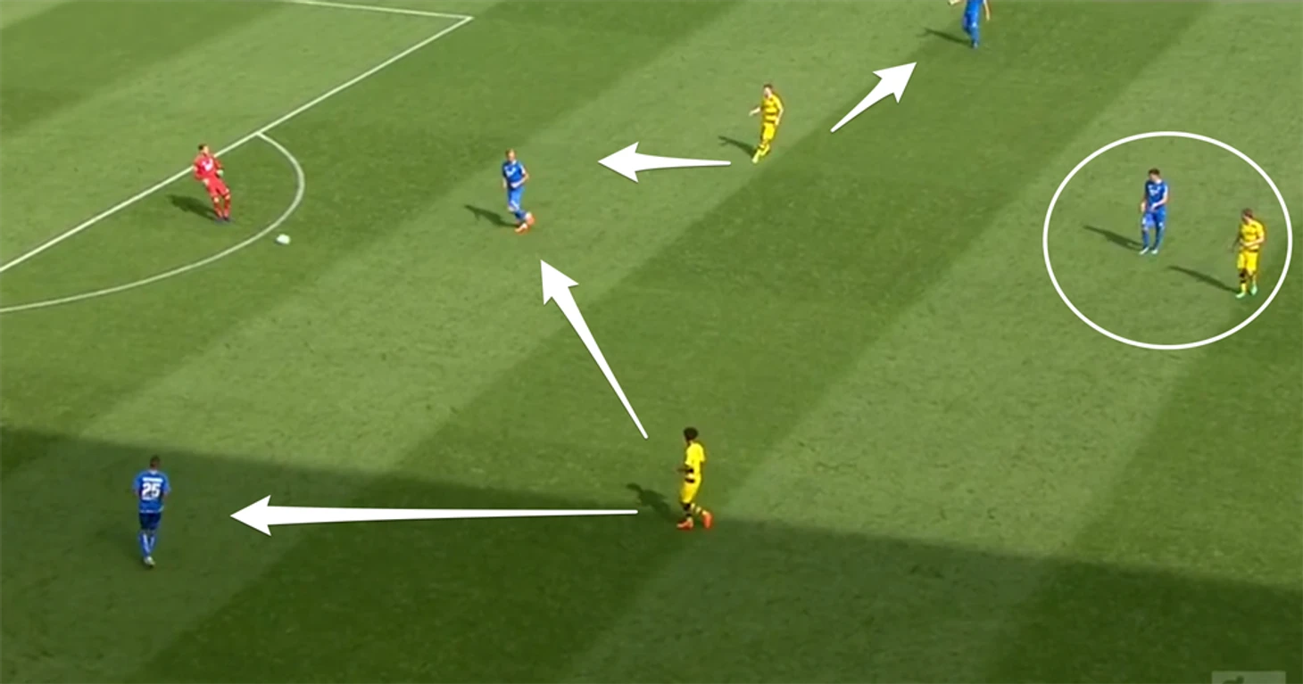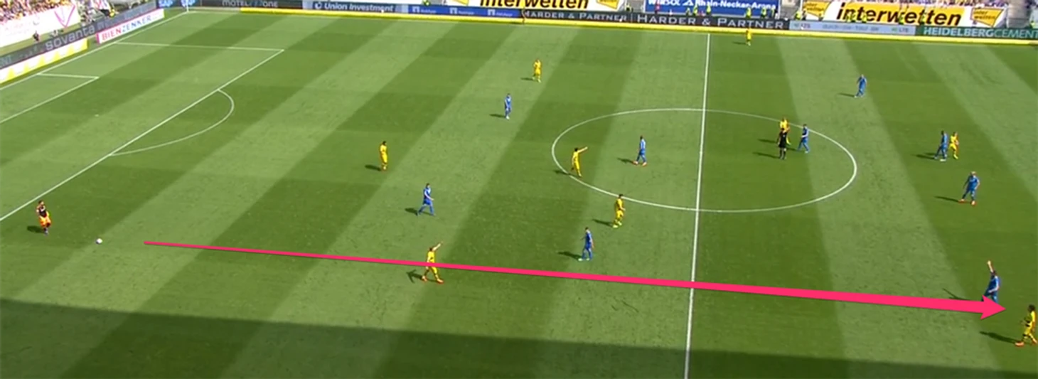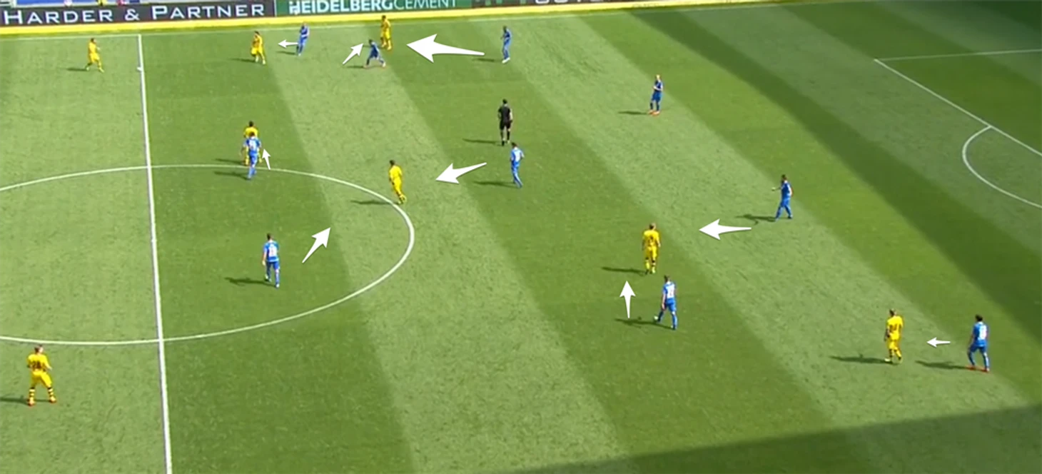 Говоря про бесперспективность позиционных атак Боруссии, нужно отмечать еще и топовую игру в защите Хоффенхайма - на каждого игрока Боруссии есть как минимум один опекающий а все зоны перекрыты.