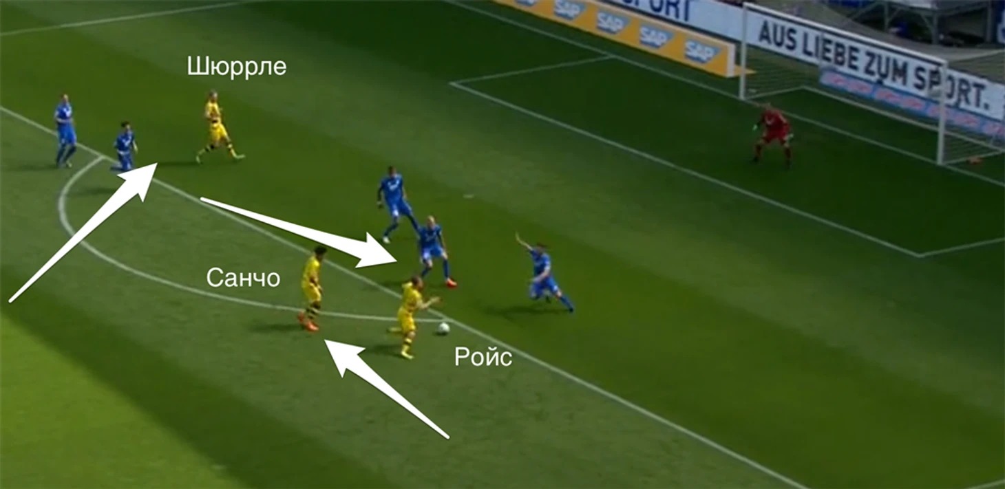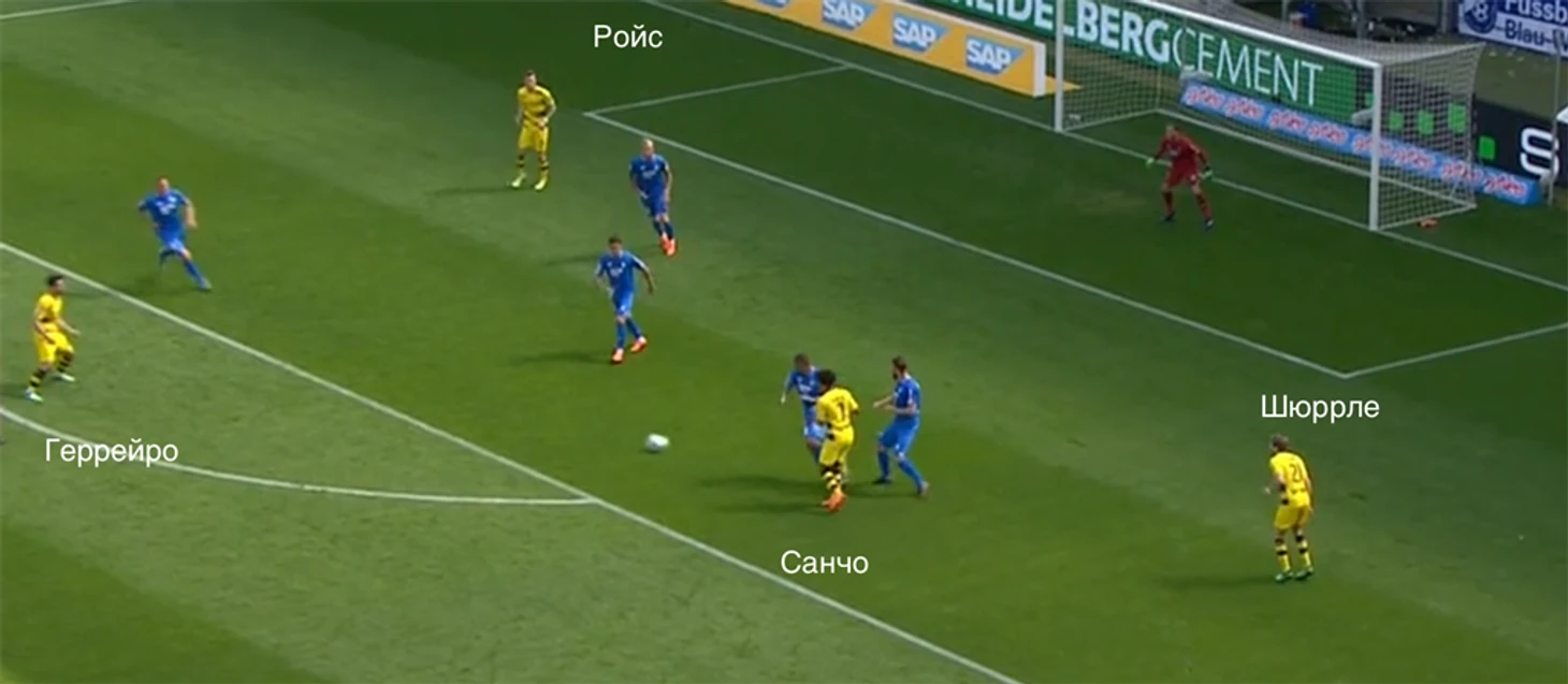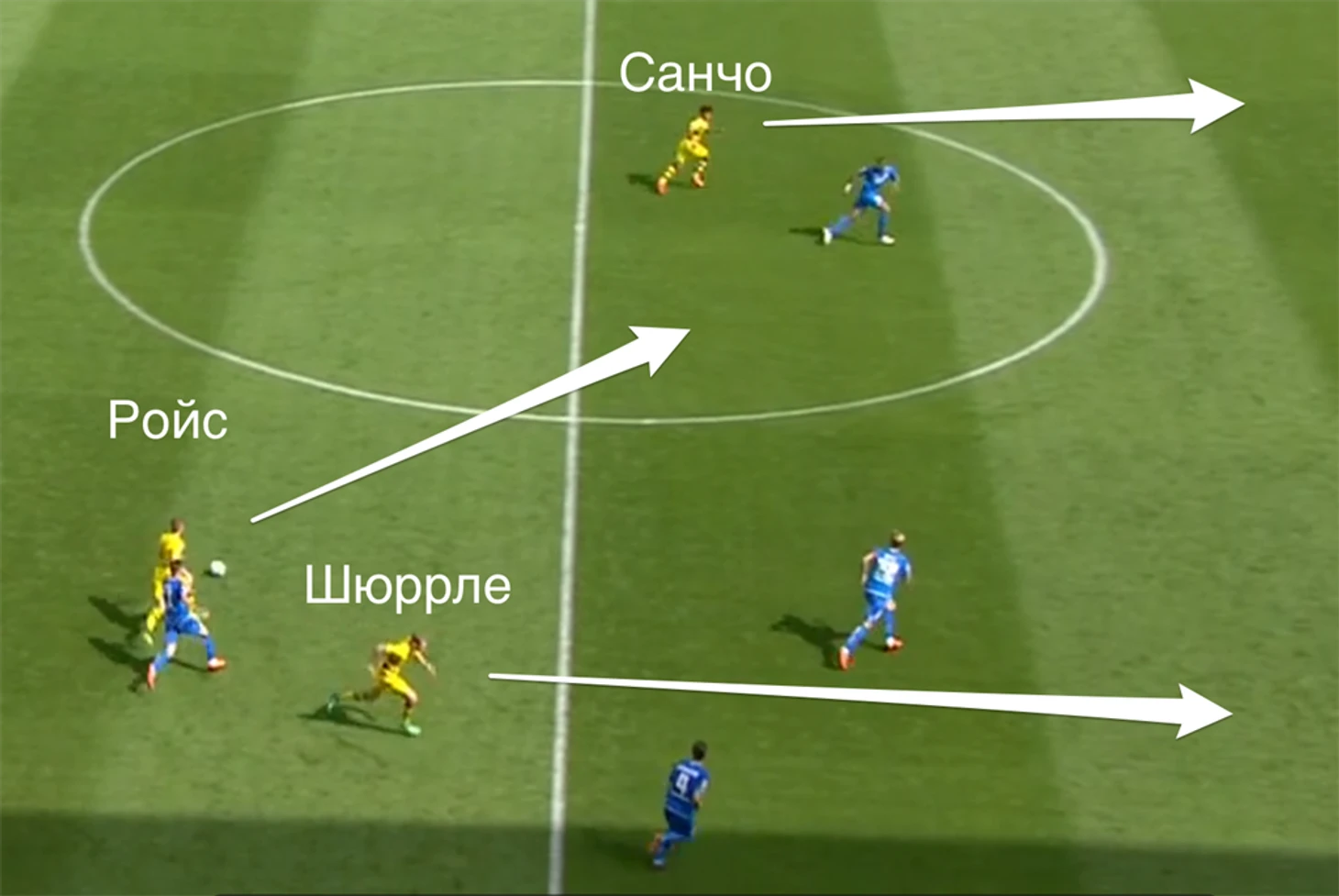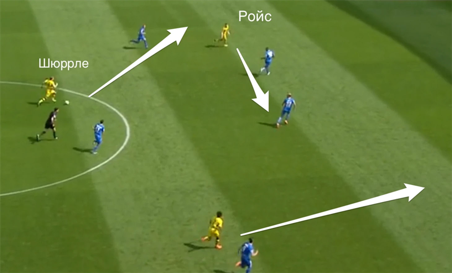 Через несколько секунд Шюррле отдаст мяч на ушедшего в центр Ройса, а сам займет его место. Еще через мгновение Ройс поменяется местами еще и с Санчо