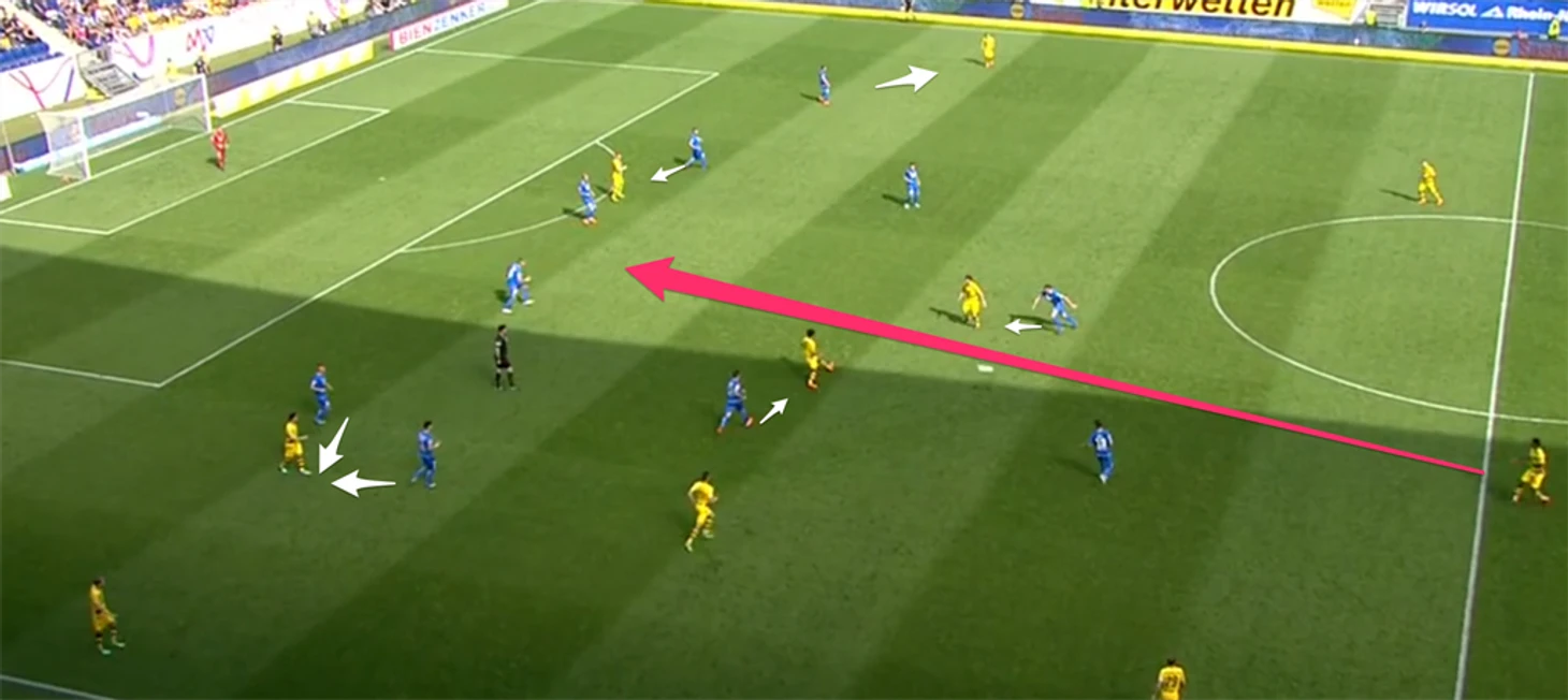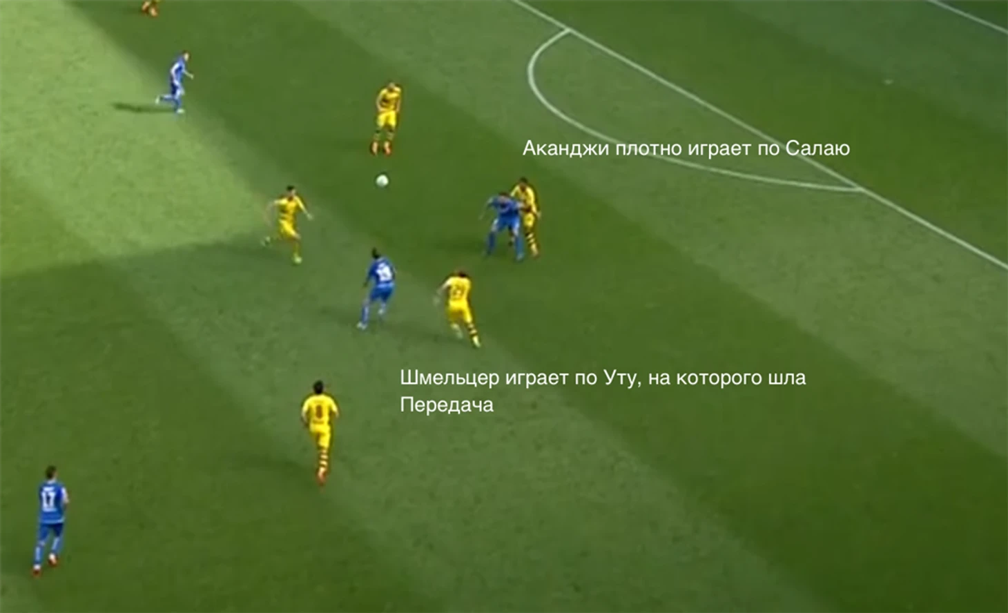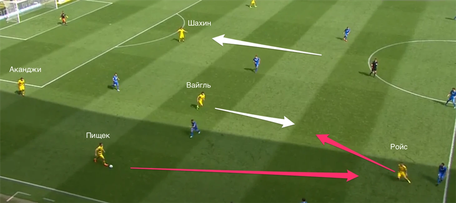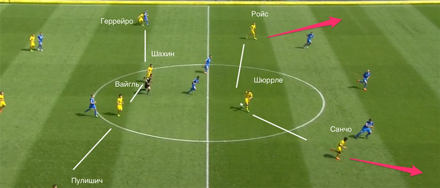 Через несколько секунд Шюррле отдаст мяч на ушедшего в центр Ройса, а сам займет его место. Еще через мгновение Ройс поменяется местами еще и с Санчо