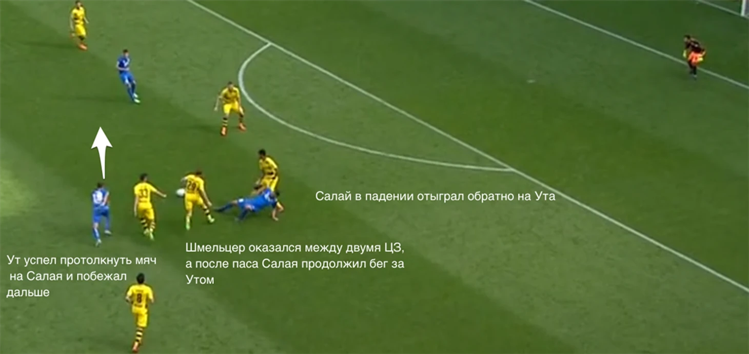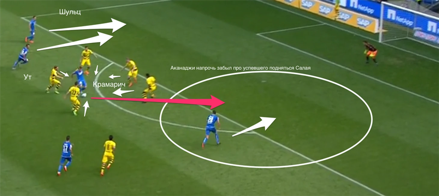 Через пару секунд Ут отдает мяч в очередной раз свободному Крамаричу и тот идеально выводит Салая на свидание с вратарем. Сразу 5 футболистов Боруссии оказались в дураках