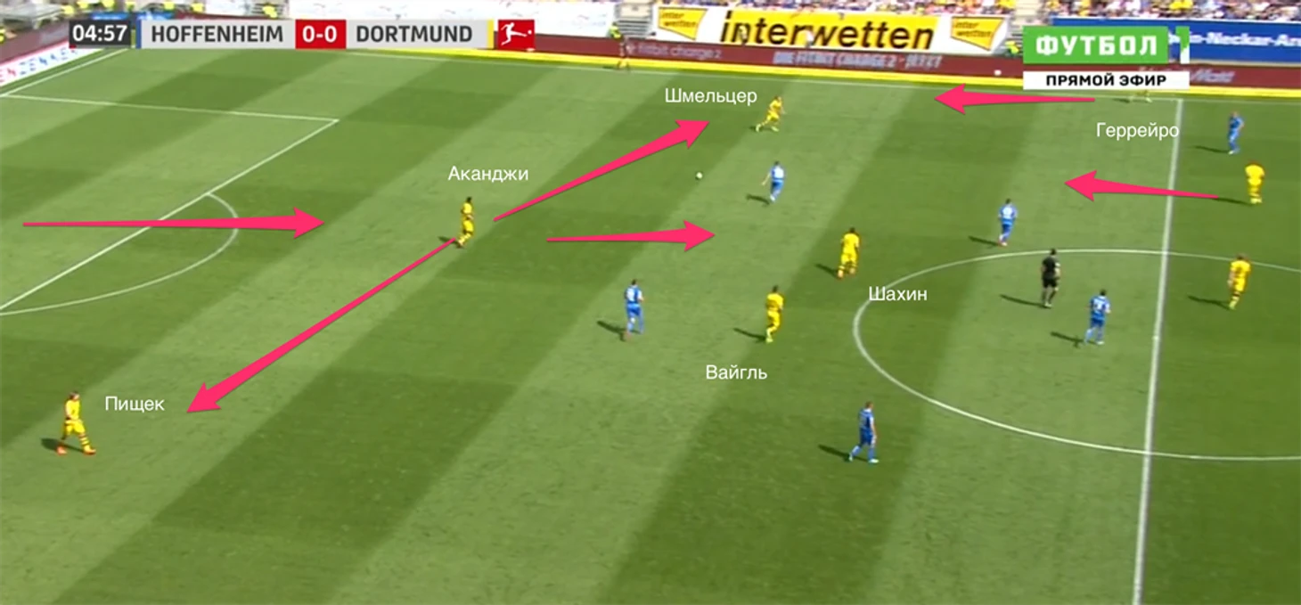 Продолжая тему центрбеков Боруссии, хочу еще раз отметить, что они показали очень приличный уровень игры и по нападающим и на подстраховке флангов. Весь матч мы видели, как трое центрбеков играли против двух нападающих Хоффенхайма. Это давало возможность безущербно страховать фланги