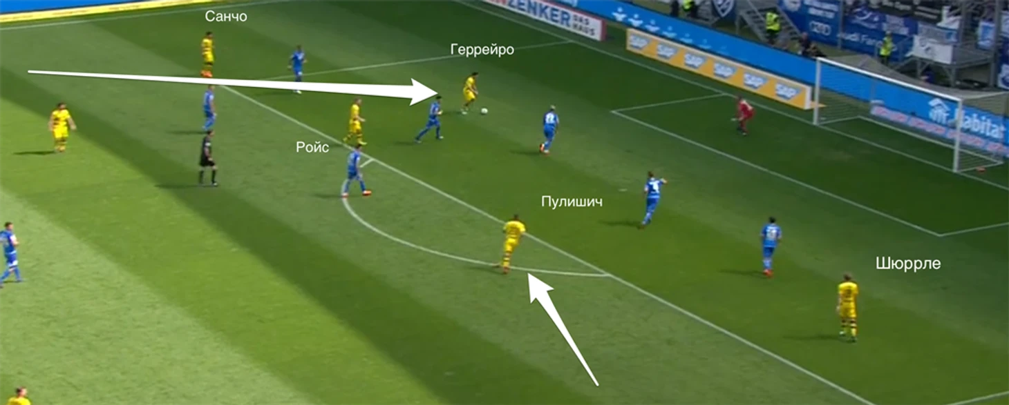 Как вы понимаете, счастья в таких действиях Боруссия себе не находила - центральные защитники Хоффенхайма, в основном, уничтожали в верховой борьбе Шюррле-Санчо-Ройса.Из атакующих движений запомнились регулярные походы Геррейро и Пулишича в центр.