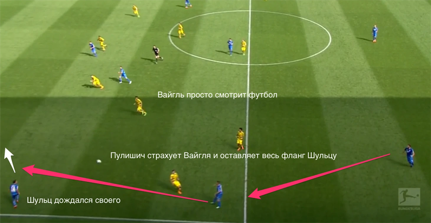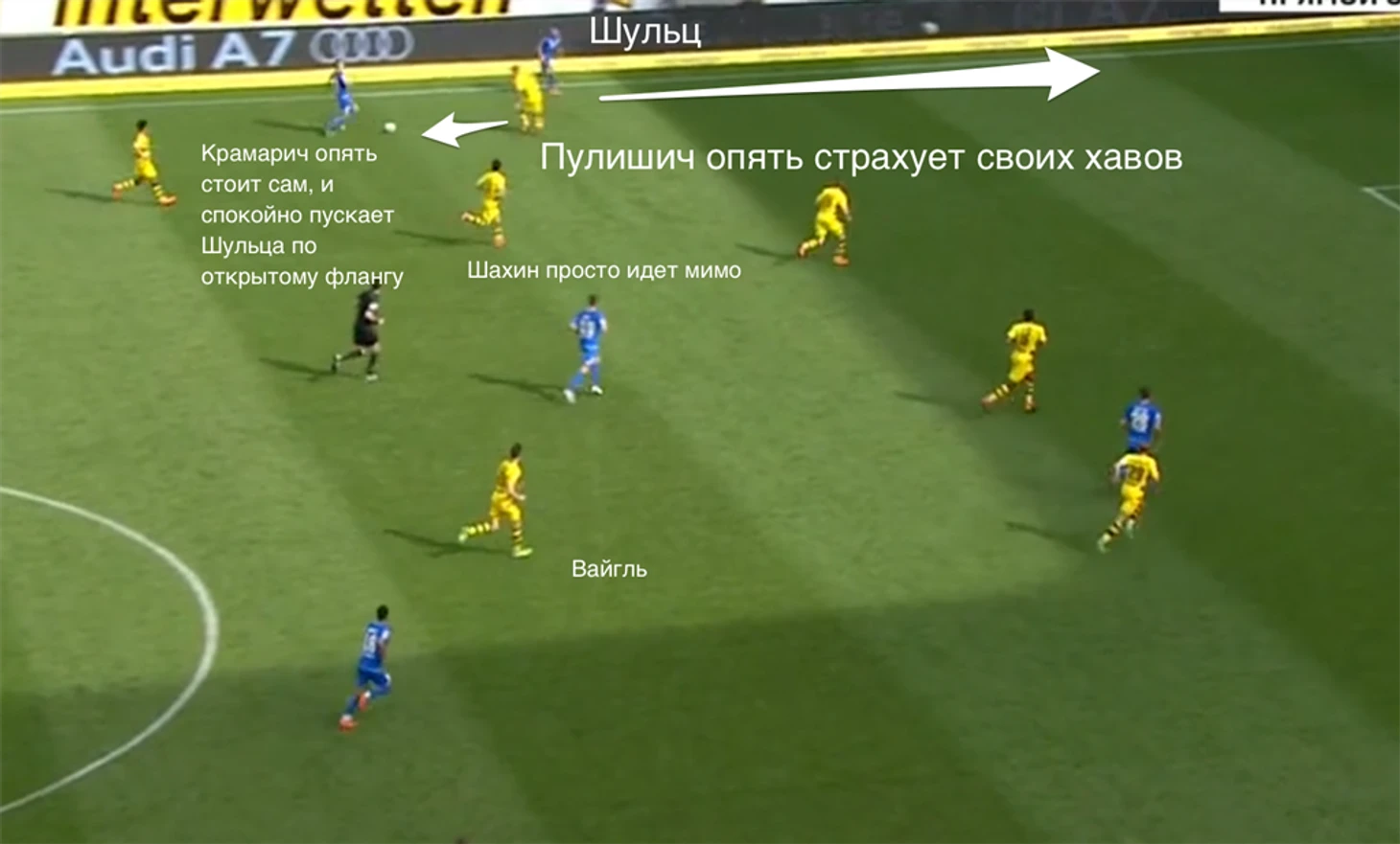 В конечном итоге, использование Пулишича в такой роли периодически приводило ветру на правой бровке обороны Боруссии. После 35 минуты Пулишич перестал добегать за Шульцом