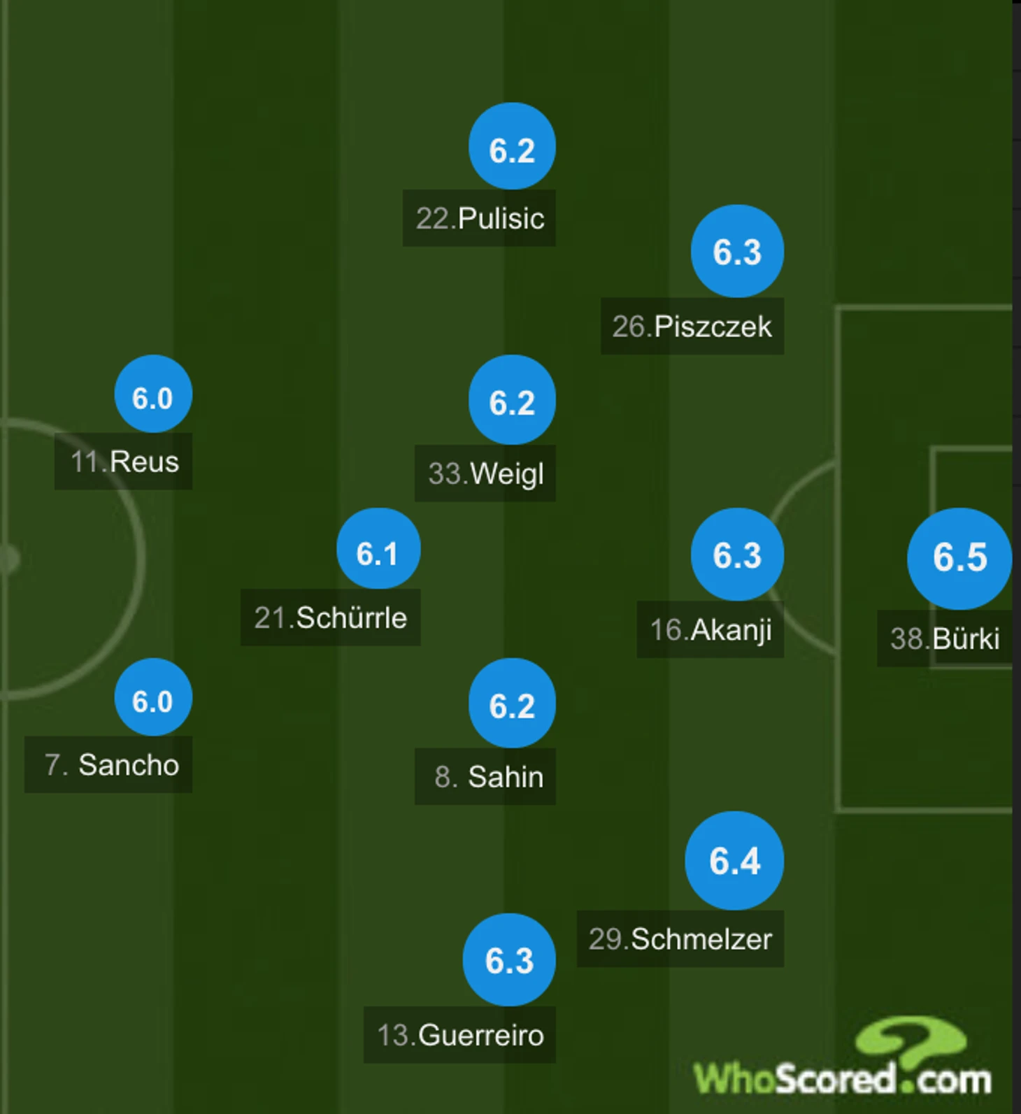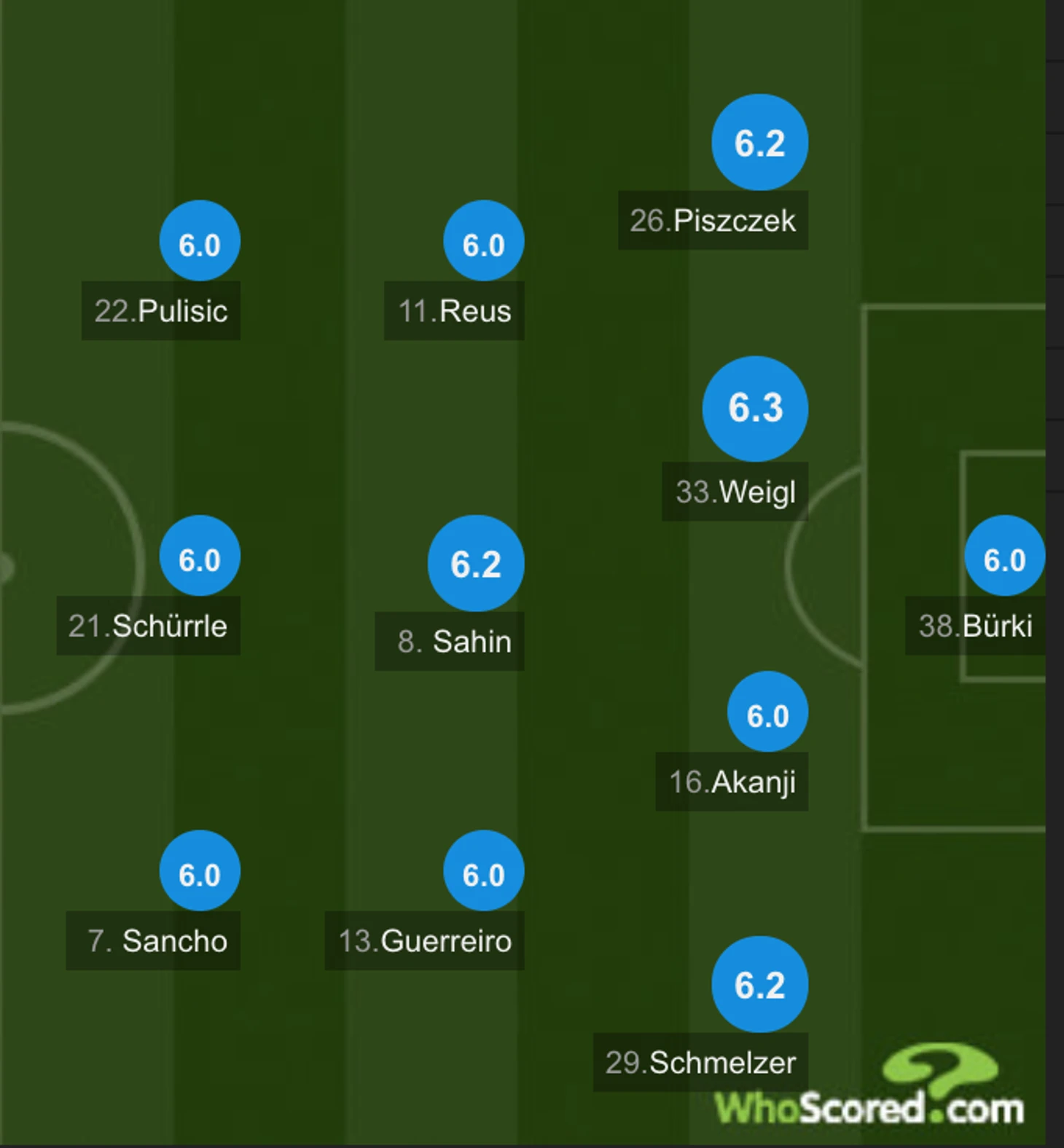 Даже с учетом трех пропущенных голов (из которых два мне кажутся достаточно таки спонтанными), я считаю, что Боруссия показала хорошую организацию в защите.В защите команда выстраивала четкие 5-2-3