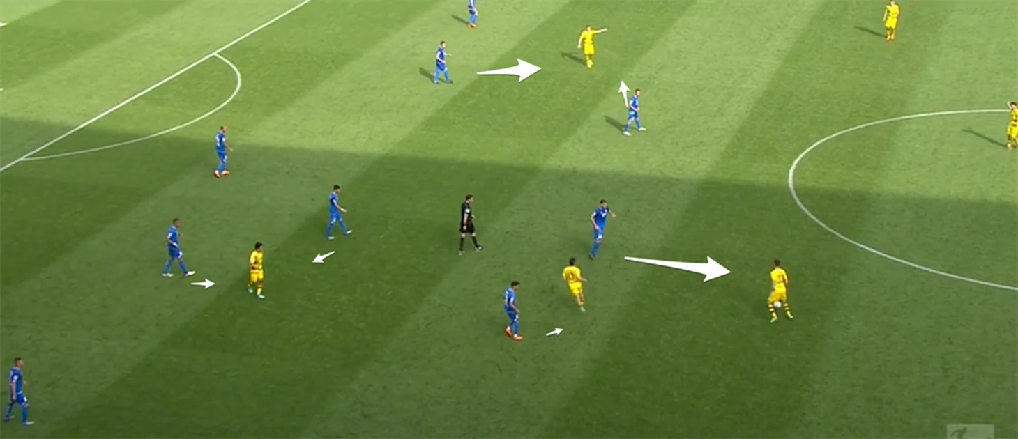 Как и любая современная команда, еще и без ярко выраженного центрфорварда, Боруссия предпочитает розыгрыш мяча низом. При розыгрышах, вся команда располагается максимально широко.Мячем ищут крайних центральных защитников, а те, в свою очередь, ищут латералей, или опускающихся нападающих