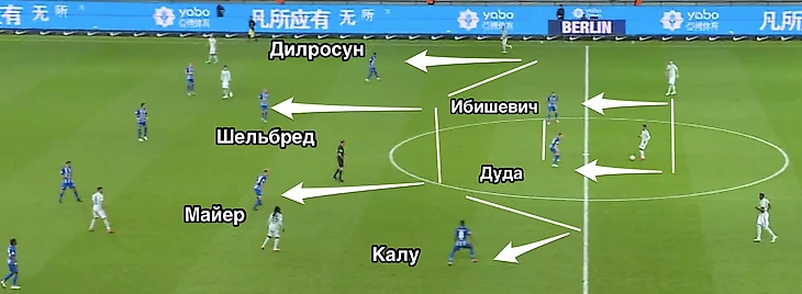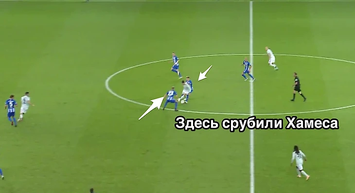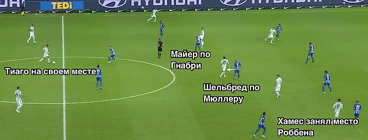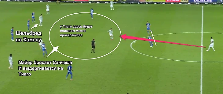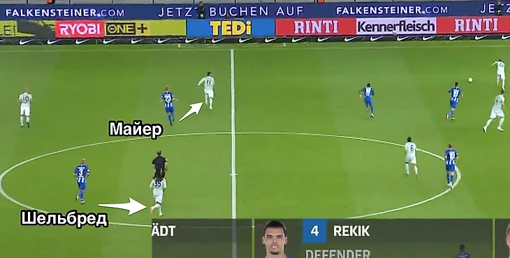 При достаточно низкой обороне, в которую играла Герта, у Шельбреда и Майера были все возможности для максимально внимательной опеки своих соперников по центру поля. Кстати, я помню пару отрезков, где Санчеш и Хамес пытались меняться местами и путать опорников Герты. Но это не вносило бардак, и Майер с Шельбредом точно так же менялись опекаемыми.