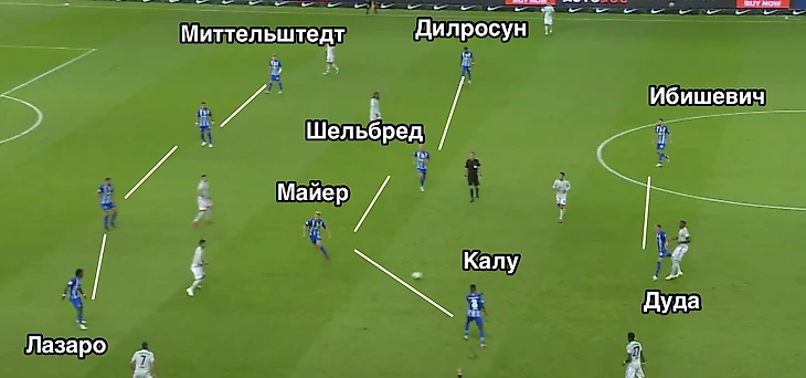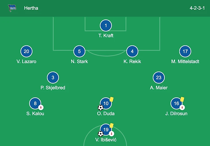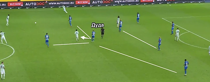 Уже во втором тайме я начал находить эпизоды, где Герта перестраивалась на 4-2-3-1 в защите, а Дуда играл персонально по Алькантаре