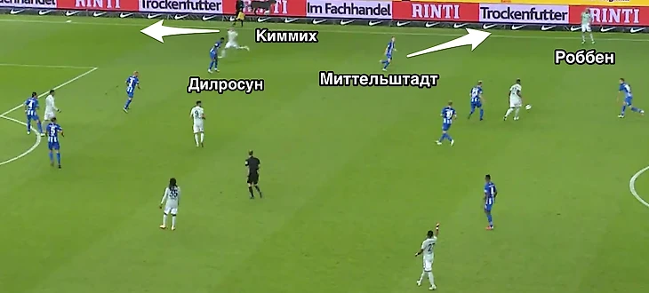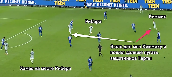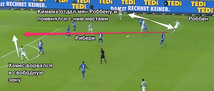 Малейшие перемещения игроков Баварии создавали огромные трудности для оборонных редутов Герты. Прямо перед вторым голом Герты я запомнил эпизод, где сами берлинцы должны были пропустить гол. Там было целое комбо движений Баварии: и Зюле пошел в атаку, и Хамес с Рибери поменялись местами, и Киммих пошел вглубь. Смотрим.