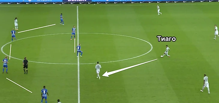 Проблемой оставалось то, что отсутствие прессинга Герты давало Тиаго постепенно оказываться в самом центре поля и уже дальше раздавать диагонали (в сумме Алькантара отдал (8 длинных передач и стал вторым после Боатенга по этому показателю).