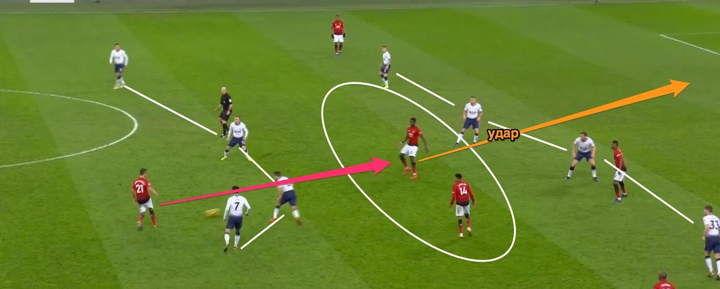 Любимой у него все равно остается зона немного левее центра, именно в ней чаще всего можно наблюдать, как шестой номер ищет себе оперативное пространство, взаимодействует с партнерами, находит варианты продолжения атаки. В этом эпизоде редкое подключение Люка Шоу забирает на себя внимание и Сиссоко и вернувшегося Алли, чем создает нужный плацдарм для француза. Поль делает топовый перевод на противоположный фланг.