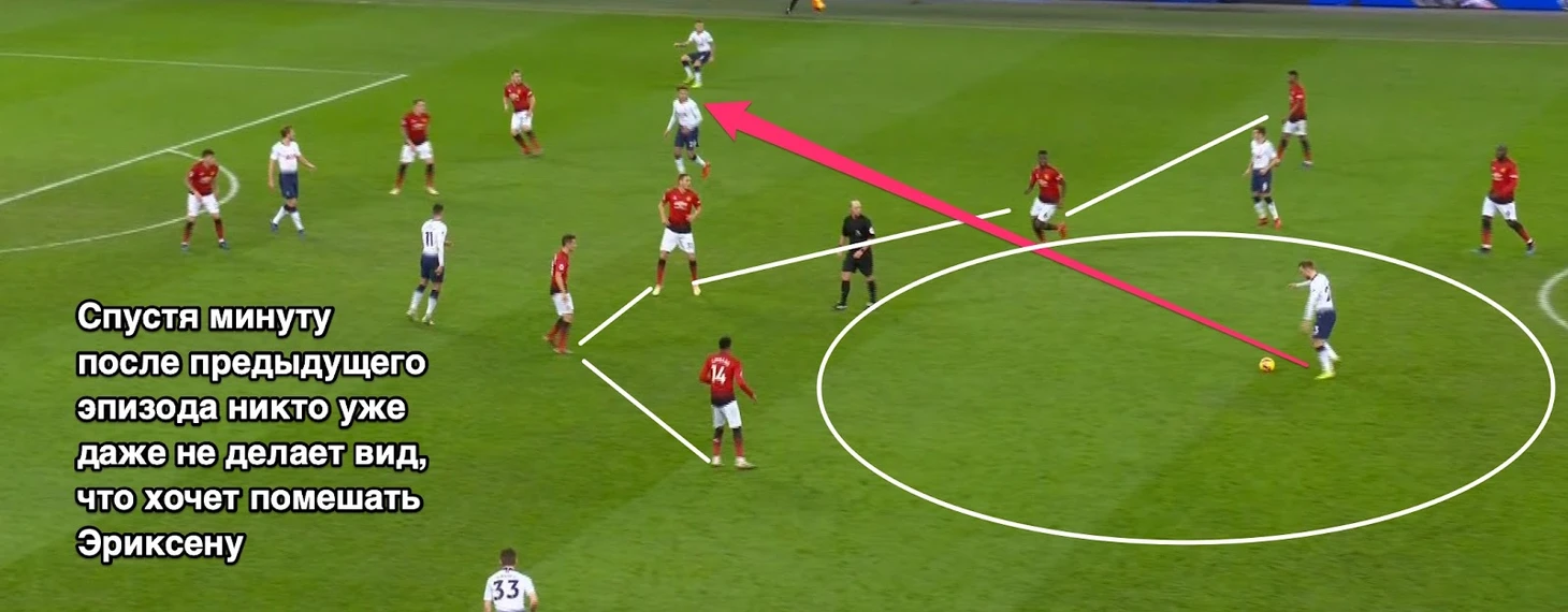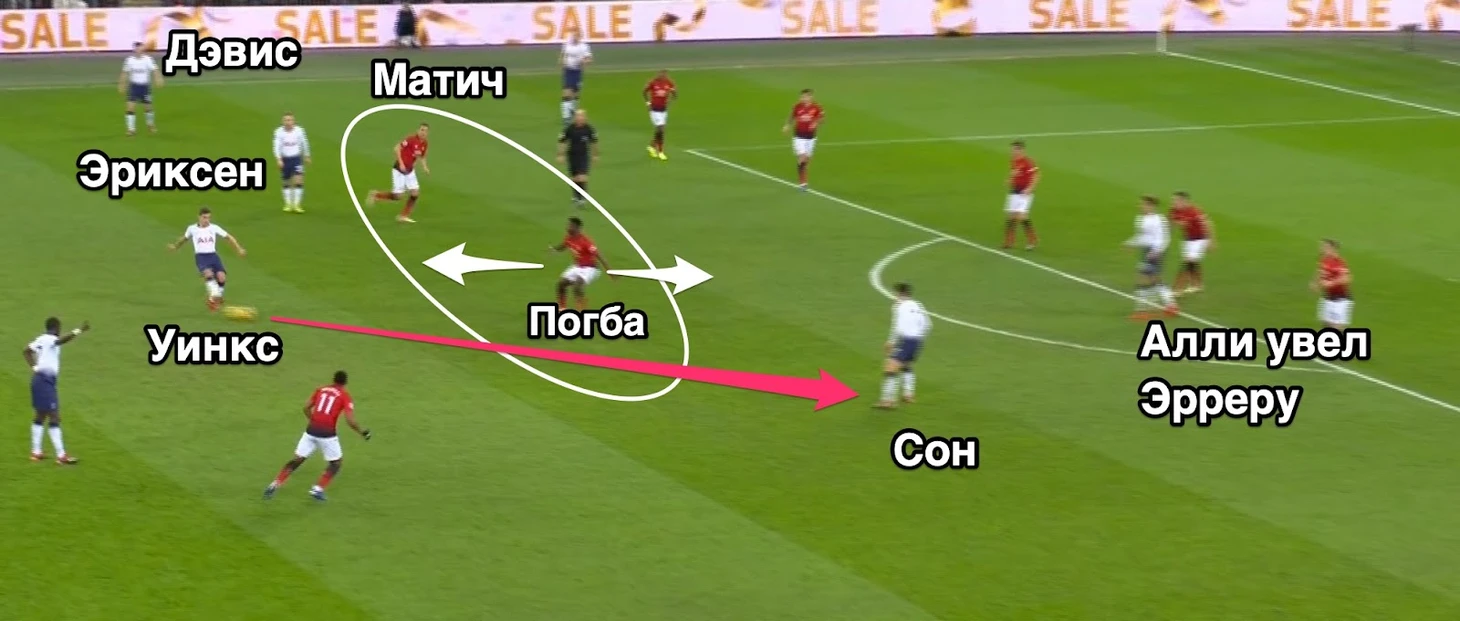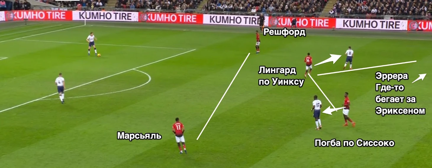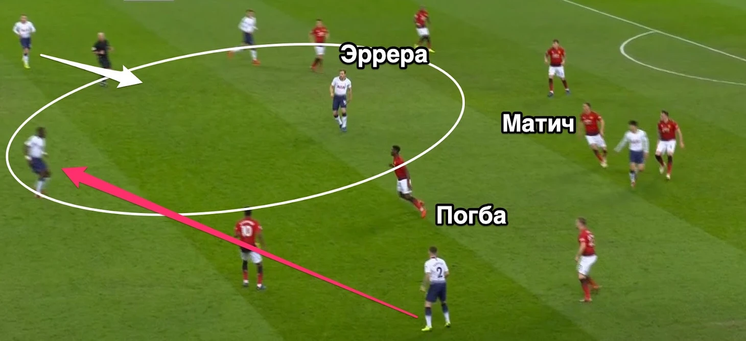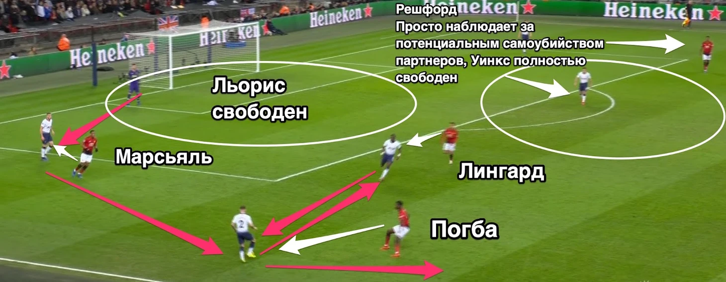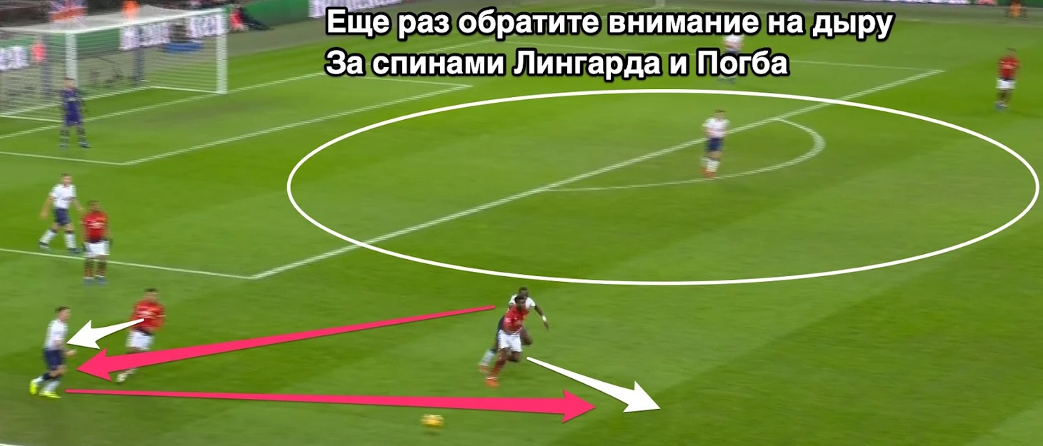 При резком включении только трех футболистов гостей «Тоттенхэм» оказывался в намного более выгодном положении, чем казалось. Триппьер, будь он немного расторопнее, спокойно мог доставить мяч на Уинкса как через своего вратаря, так и простым черпачком за спину Лингарда. Даже Сиссоко, который, получив мяч от партнера под прессингом, точно так же засунул круглого ему обратно, мог бы качнуть Лингарда полудвижением и отрезать сразу четырех оппонентов. В итоге Сиссоко и с Триппьером попытались разыграть стеночку, Погба приняли очень редкое для себя элитное решение в оборонительных действиях и прочитал наперед пас на своего соотечественника. Шоу не сильно пытался помогать, но его помощь и так не понадобилась.