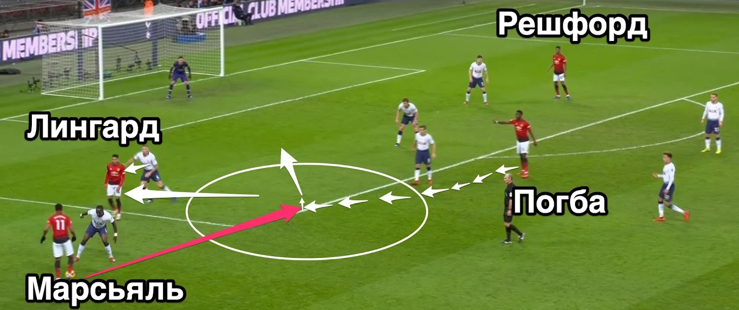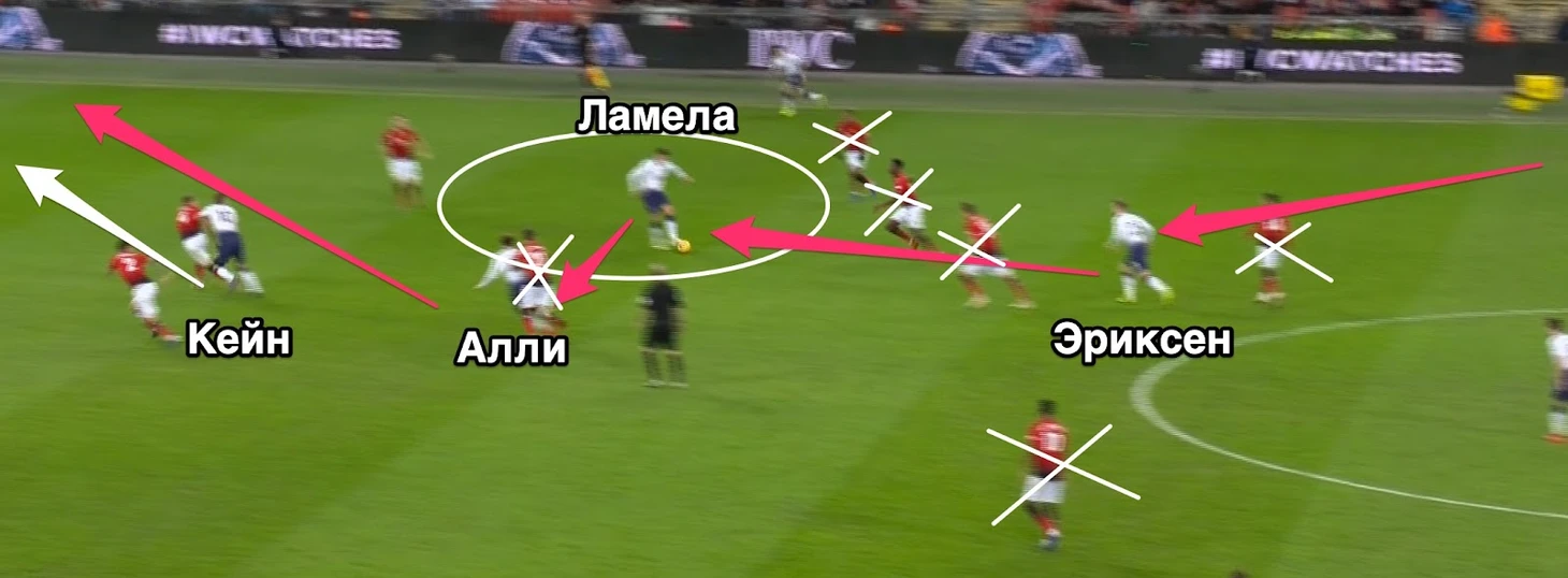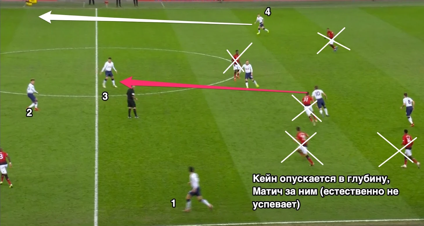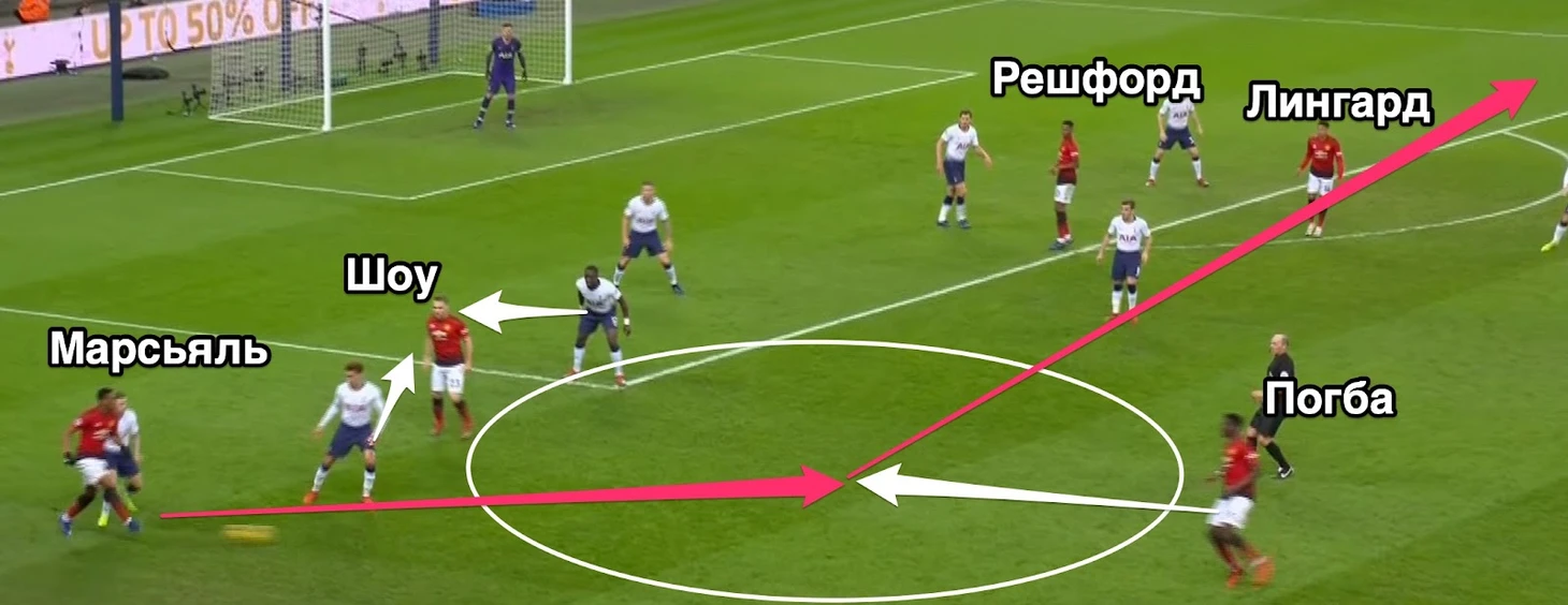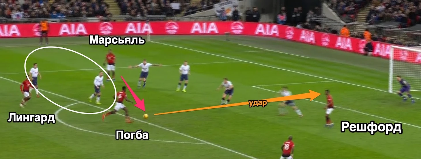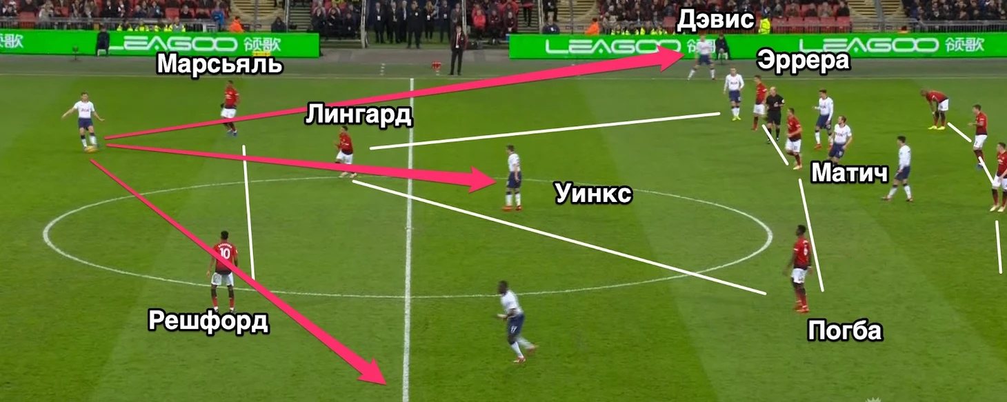 При резком включении только трех футболистов гостей «Тоттенхэм» оказывался в намного более выгодном положении, чем казалось. Триппьер, будь он немного расторопнее, спокойно мог доставить мяч на Уинкса как через своего вратаря, так и простым черпачком за спину Лингарда. Даже Сиссоко, который, получив мяч от партнера под прессингом, точно так же засунул круглого ему обратно, мог бы качнуть Лингарда полудвижением и отрезать сразу четырех оппонентов. В итоге Сиссоко и с Триппьером попытались разыграть стеночку, Погба приняли очень редкое для себя элитное решение в оборонительных действиях и прочитал наперед пас на своего соотечественника. Шоу не сильно пытался помогать, но его помощь и так не понадобилась.