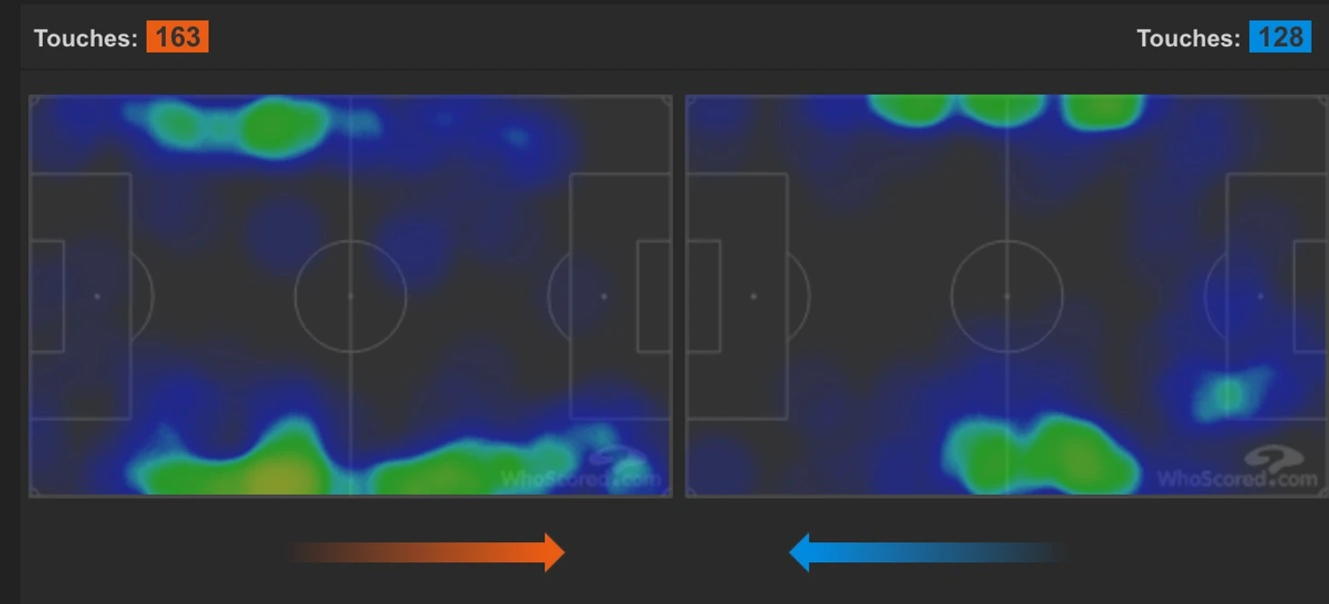 Здесь нужно отдать дань разнице в планах наставников по использованию своих ромбов: у Почеттино, который пытался играть первым номером, высокое и максимально широкое расположение крайков вообще является основой игровой модели, а тройка нападающих традиционно пытается находиться в максимальной близости друг другу. Уле играл же более осторожно, делая упор на тройку нападающих, усиленную Полем Погба, с максимально лимитированным использованием сил фулбеков (что было более чем, умно: вспомните хотя бы контратаку и удар Алли после редкого подключения Шоу во втором тайме). Даже если абстрагироваться от количества касаний, на тепловой карте можно проследить разницу в высоте активности Дэвиса/Триппьера (слева) против Янга/Шоу