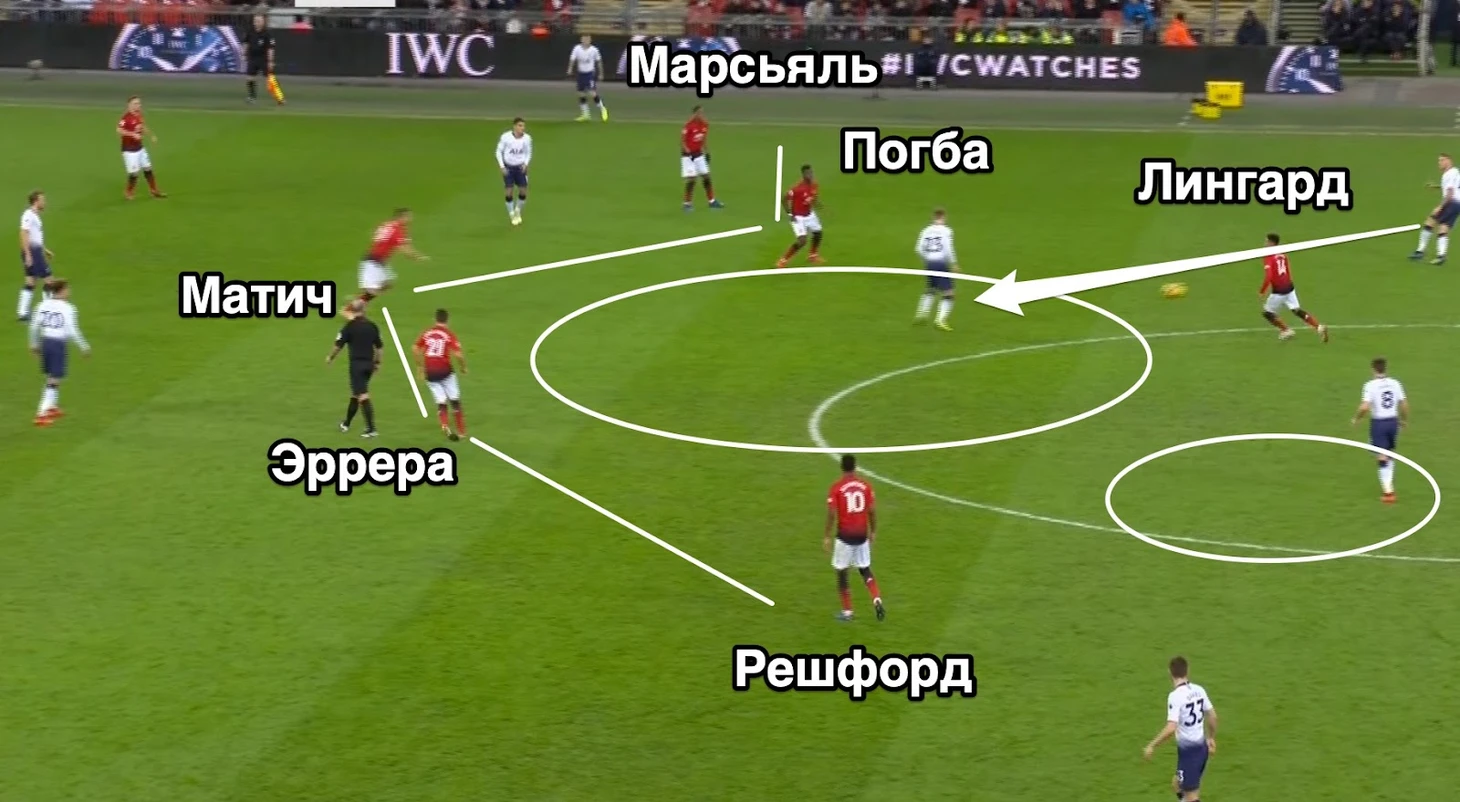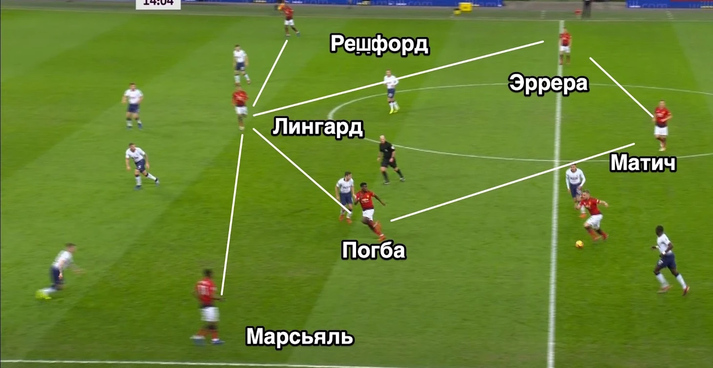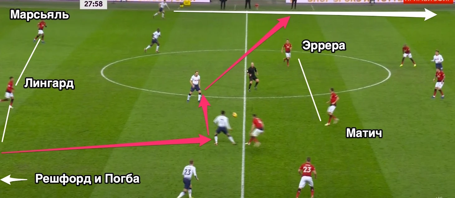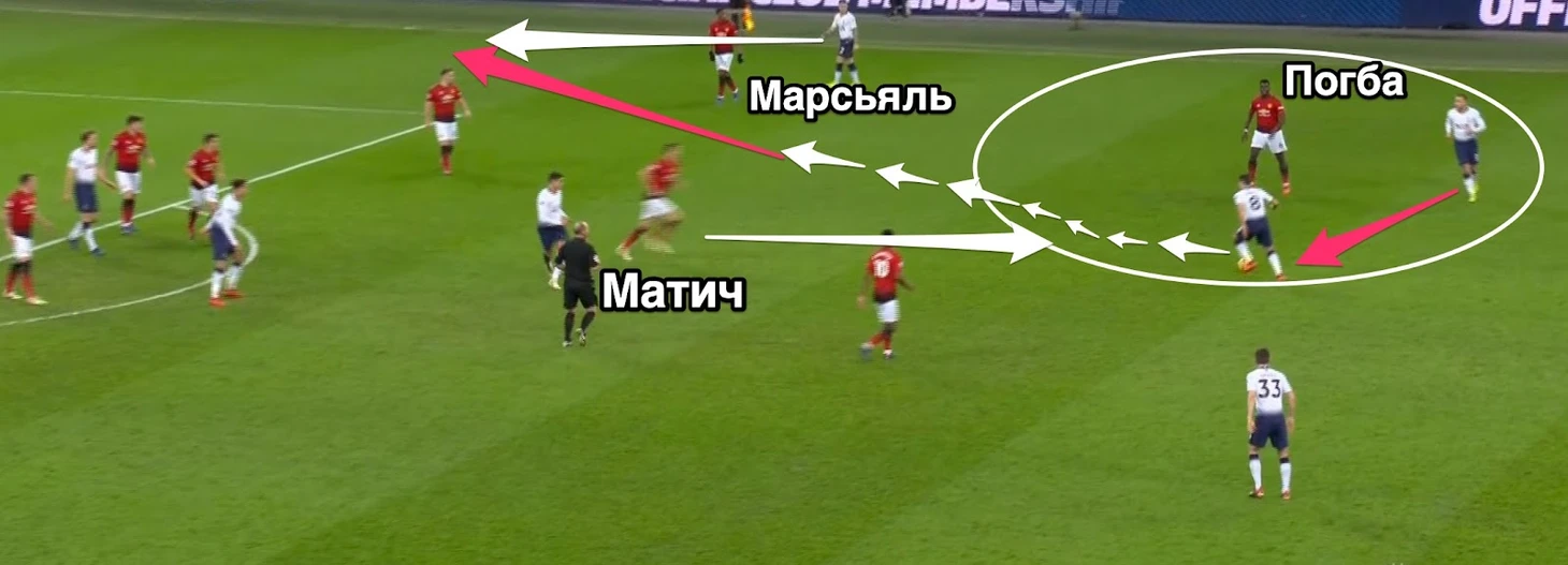Француз действительно воспрял, его как будто сняли с предохранителя и он снова начал делать на поле именно лучшие вещи. В позиционных атаках команда Сульшера играет в что-то вроде 4-2-4, или 4-2-2-2, если подойти к этому вопросу сдержаннее. При Сверх осторожном использовании Матича, Эрреры и фулбков, в матче против «Тоттенхэма» именно Погба выступил главным помощником тройки атакующих игроков, можно даже сказать, что он превратил ее в полноценную четверку.