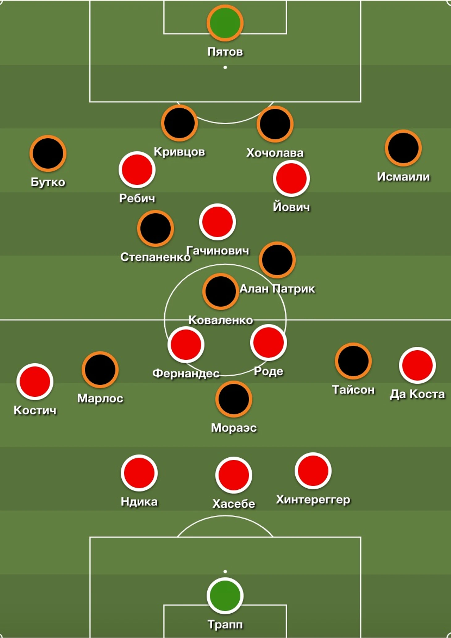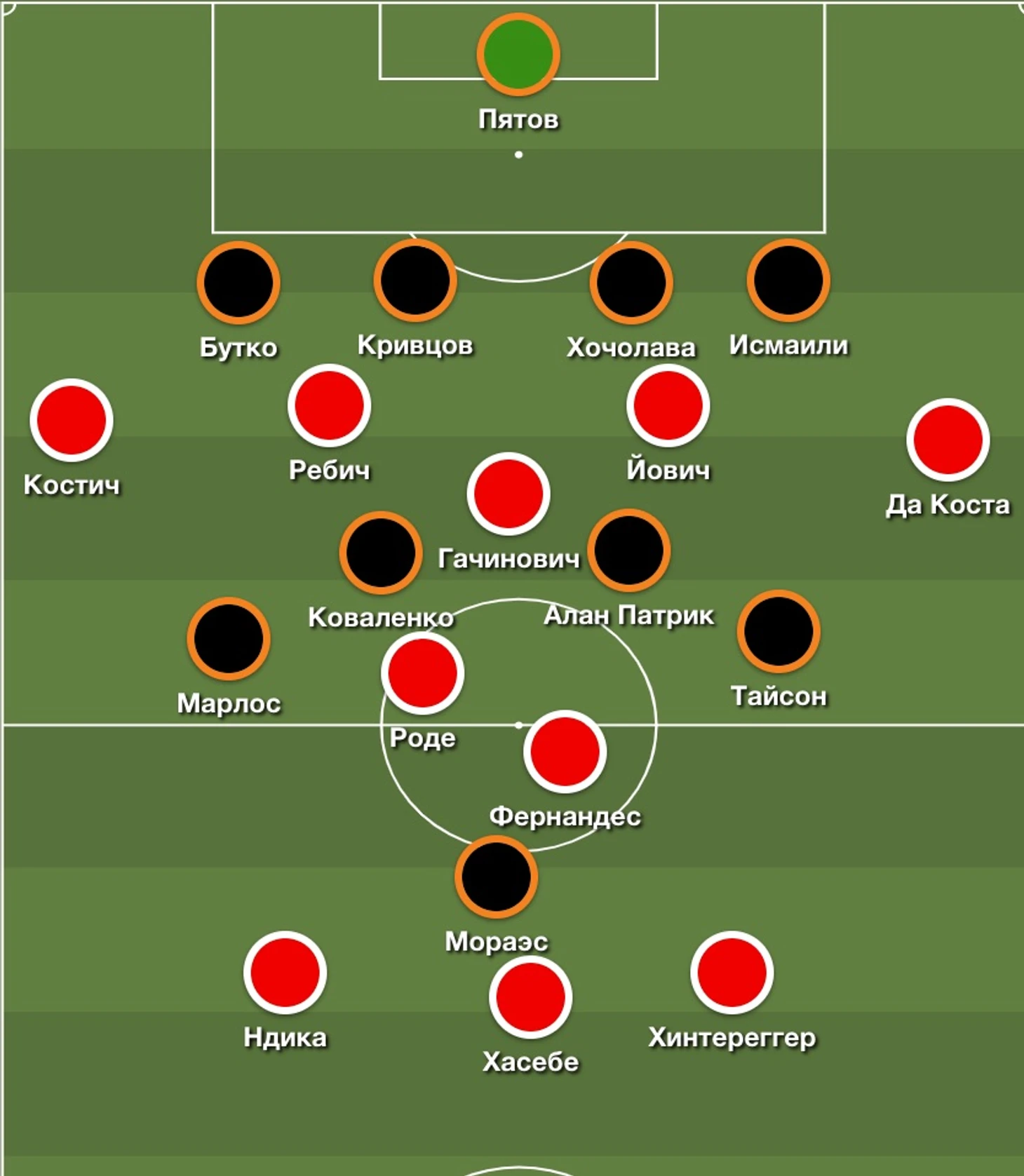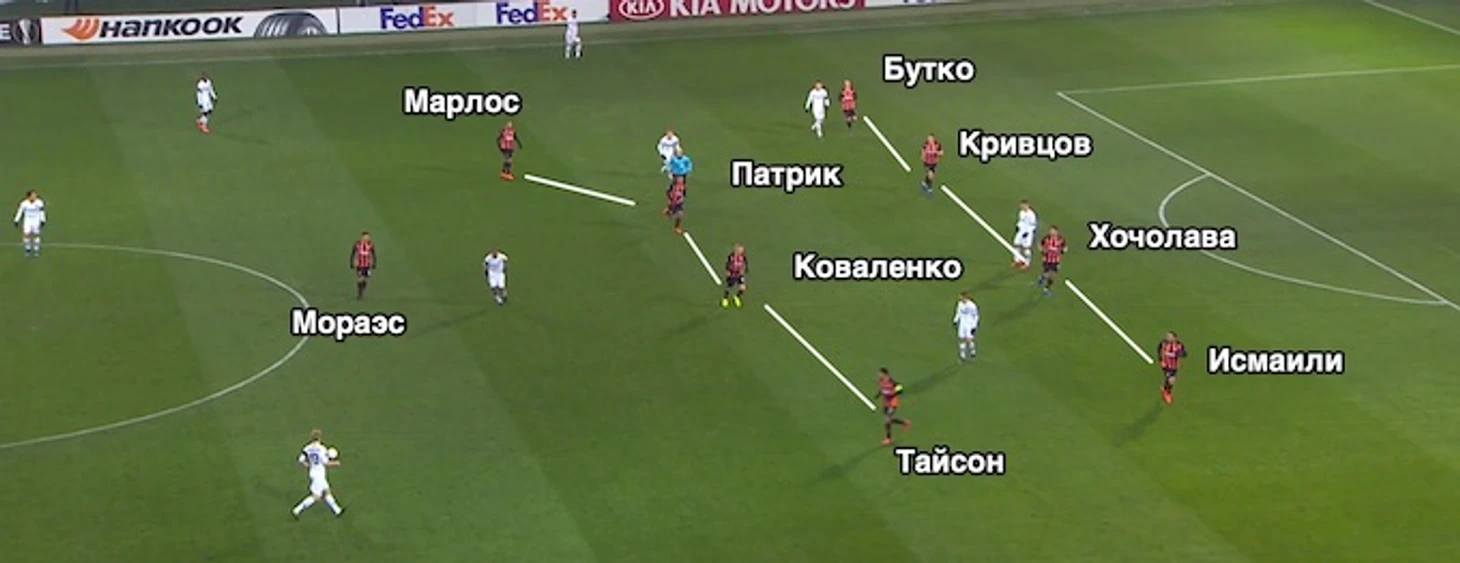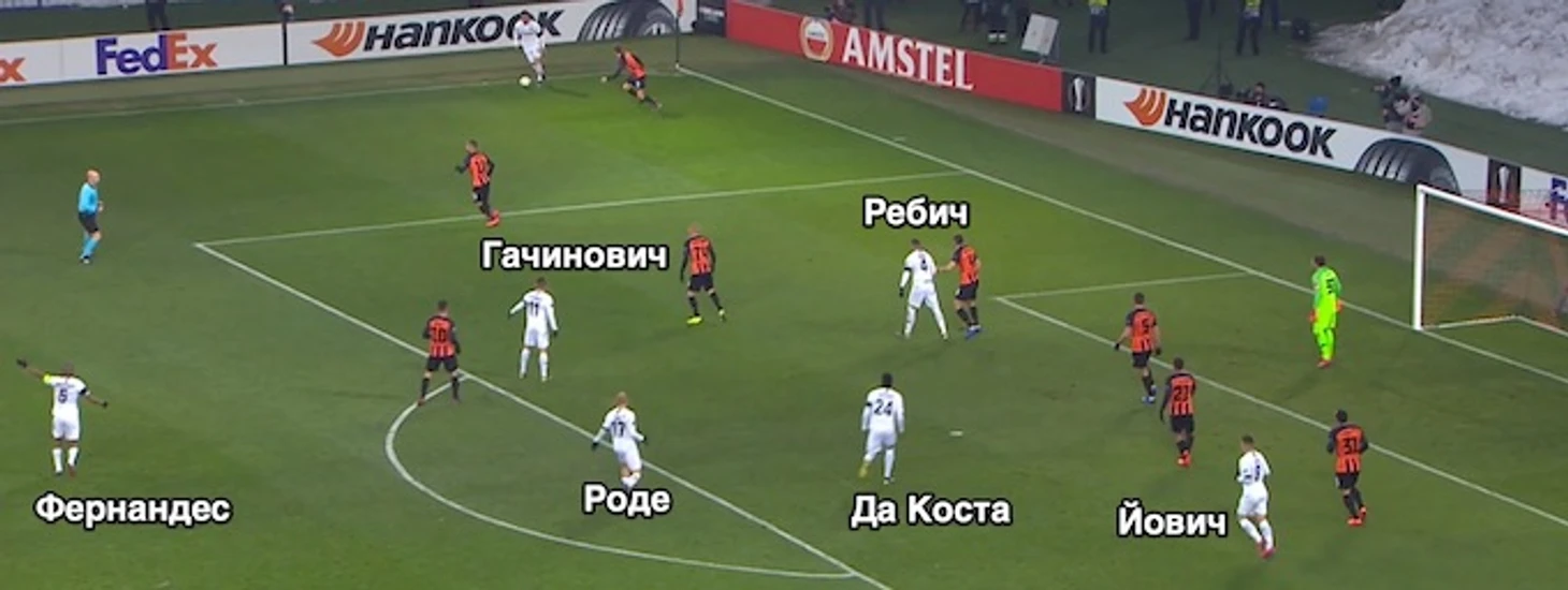 С одной стороны кажется, что «Шахтер» сохранял компактность линии и все сдвинулись на одного футболиста влево. С другой стороны: выход Хочолавы в полуфланг кажется необоснованным, он и на Йовича никакого давления не оказал и Да Косту пропустил бы за спину. С Бутко тоже ситуация спорная: он вроде и сдвинулся в том же порядке, что и его партнеры, но Ребича должен был держать скорее Кривцов…