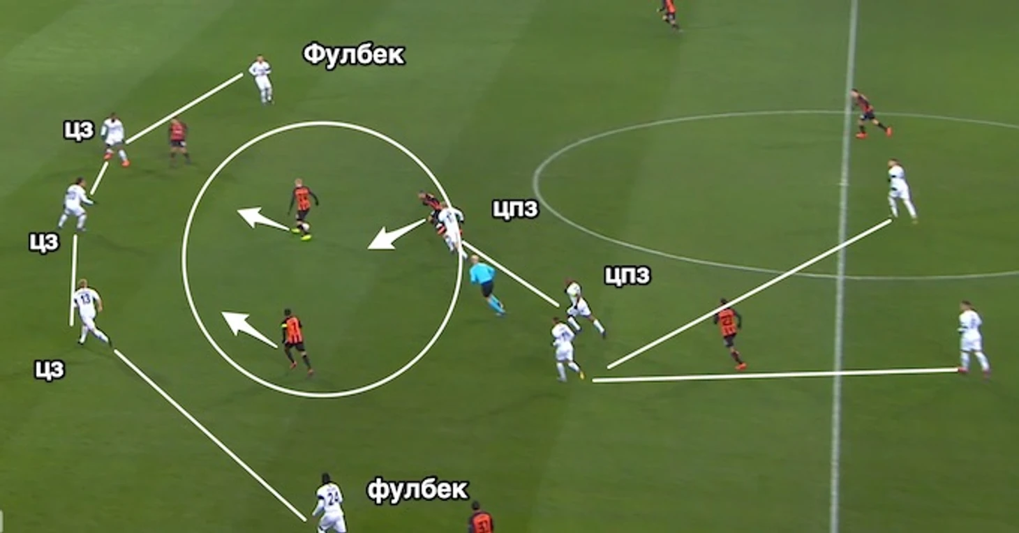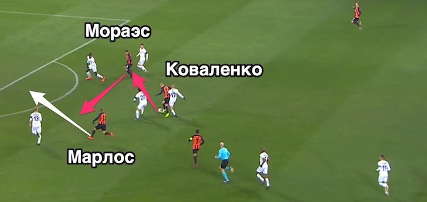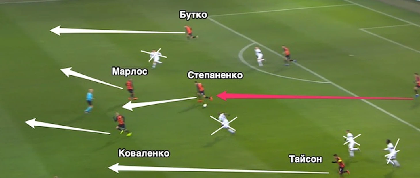 С одной стороны кажется, что «Шахтер» сохранял компактность линии и все сдвинулись на одного футболиста влево. С другой стороны: выход Хочолавы в полуфланг кажется необоснованным, он и на Йовича никакого давления не оказал и Да Косту пропустил бы за спину. С Бутко тоже ситуация спорная: он вроде и сдвинулся в том же порядке, что и его партнеры, но Ребича должен был держать скорее Кривцов…