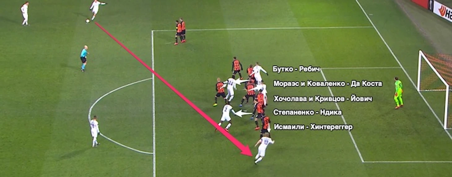 Прессинг «Айнтрахта» очень далек от идеального. Как и любой персонализированный прессинг, он основывается на том, что каждый игрок твоей команды не должен 1 в 1 проиграть соответствующему сопернику. При отыгрыше хотя бы одного из прессингующих игроков, рушится все конструкция команды и защитники оказываются в проигрышном состоянии. На трансляции это было пропущено, но именно после проваленного прессинга в центре появилась ситуация, в которой «Шахтер» заработал пенальти.