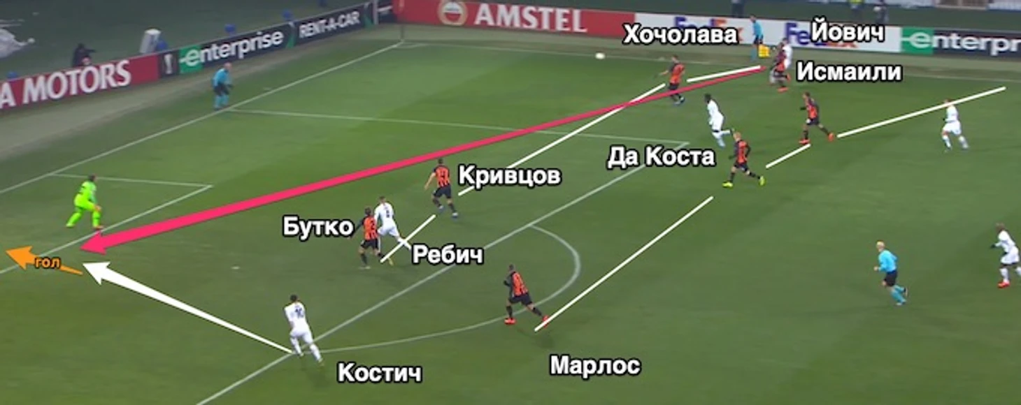 В ситуации с голом Костича можно снова сказать о недостаточном уровне разбора соперника при навесах. Здесь тяжело сразу сказать, чья именно это была ошибка и была ли это ошибка вообще, но размен получился явно не сторону «Шахтера». Бутко и Кривцов пошли накрывать Ребича, а Хочолава выдвинулся на ушедшего на фланг Йовича, который все равно в итоге оформил ассист.