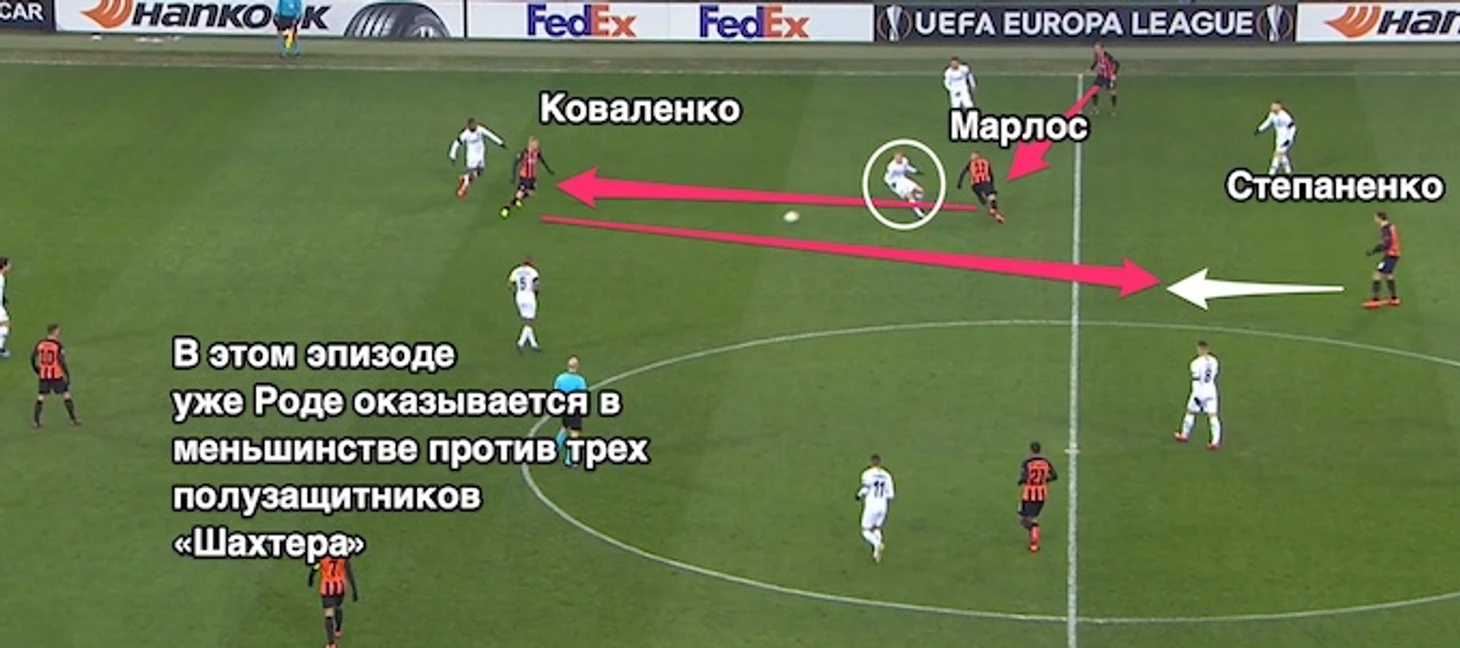 Мобильность Марлоса и Тайсона при поддержке Коваленко, направленная в центральную зону, создавала немцам достаточно много проблем. Усугубляла проблемы еще и склонность Роде и Костича (о нем еще поговорим) к походам в центр. Остававшийся один в опорной зоне Фернандес элементарно не мог сдерживать перегрузы центральной части поля и у «Шахтера» получались вполне адекватные контратаки.