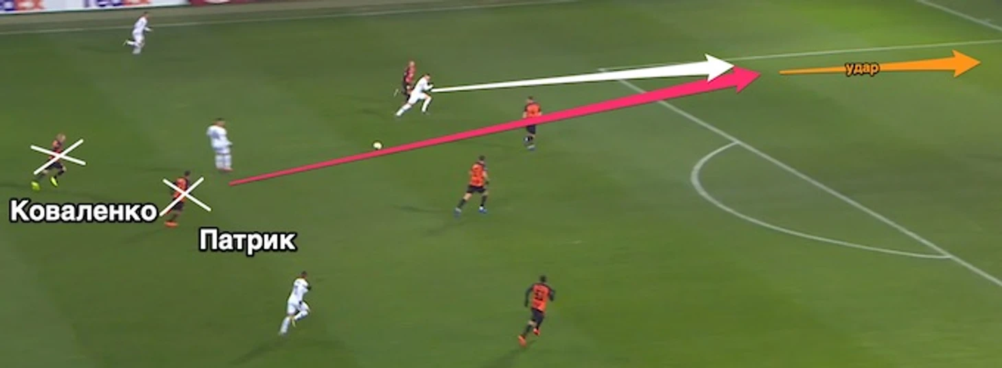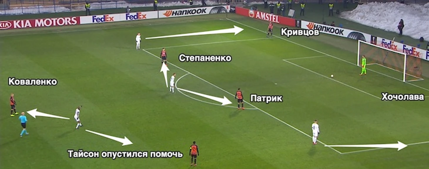 С опустившимися Коваленко и Тайсоном, играя 5 на 4 у своих ворот, Пятов все равно не пытался искать варианты доставки мяча верхом на кого-то из тройки атакующих полузащитников или фланговых защитников, как это было с тем же «МанСити». В этом эпизоде Алексей в какой-то момент дает команду всем подтягиваться вперед и просто запускает мяч верхом.
