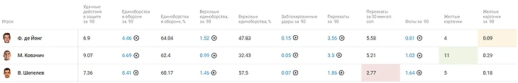 Из этой таблицы видим, что Шепелев чаще вступает в единоборства, но в его игре меньше перехватов (это качество прямо характеризует умение читать игру и предугадывать эпизод) и он чаще остальных фолит. На примере Ковачича мы видим, что фолов не так много, но желтых карточек достаточно много. Это может говорить о том, что он не очень терпелив в фазе отбора мяча и часто совершает грубые фолы. У меня сразу всплывают в памяти моменты, когда Матео в роли догоняющего не терпеливо продолжает движение, а хватает за футболку и фолит. Такой фол практически всегда награждается карточкой. Так что в оборонительном плане эти игроки действительно не дотягивают, использовать таких футболистов в команде с оборонительным стилем чревато большими проблемами.