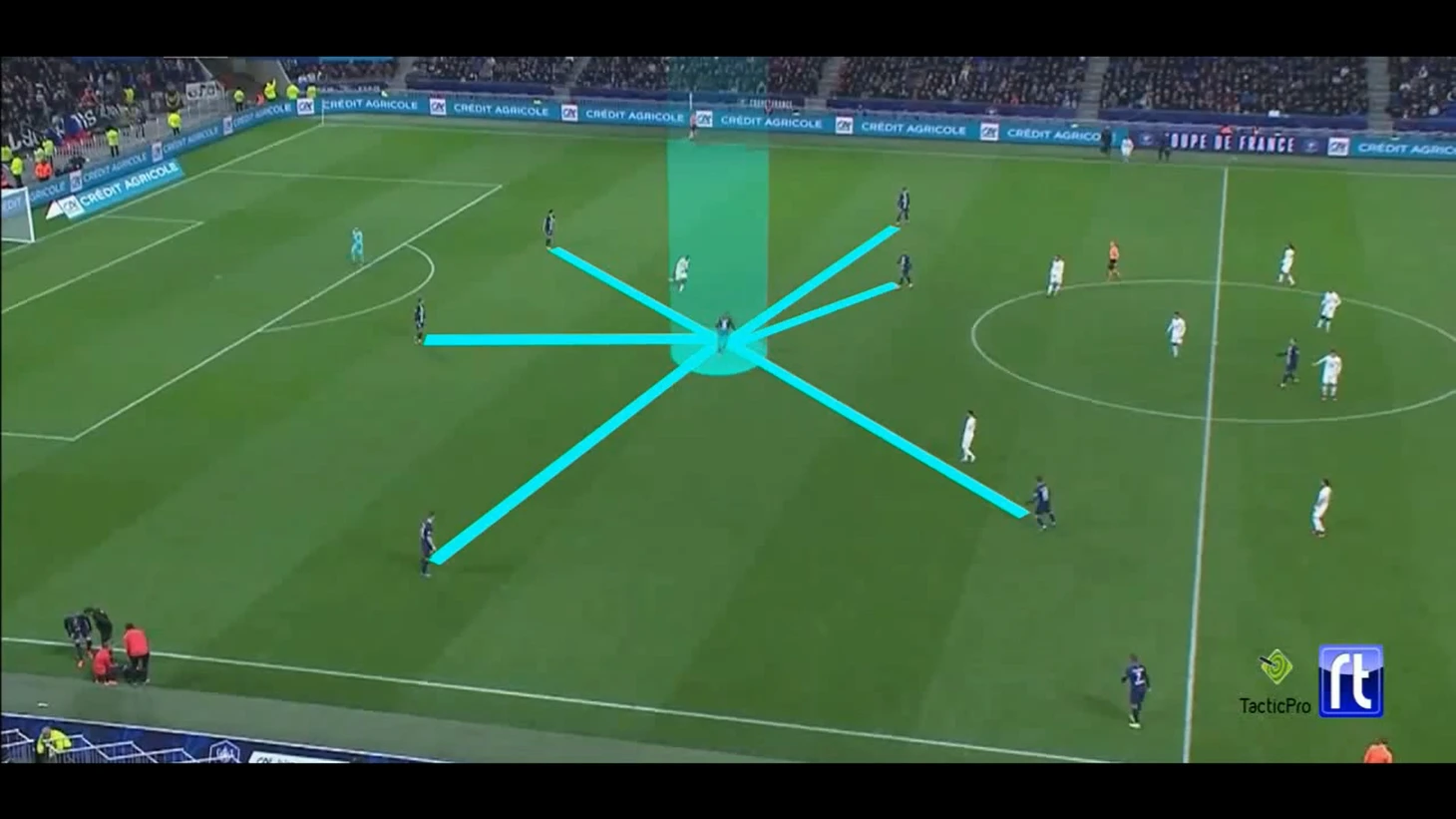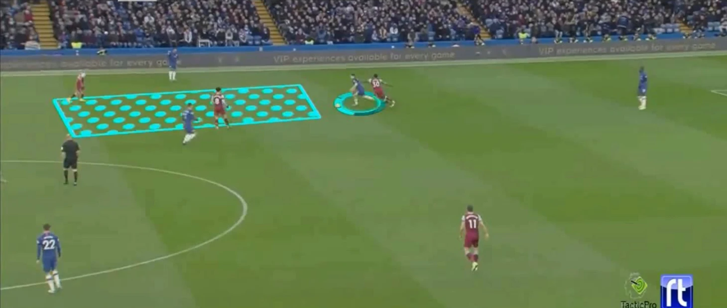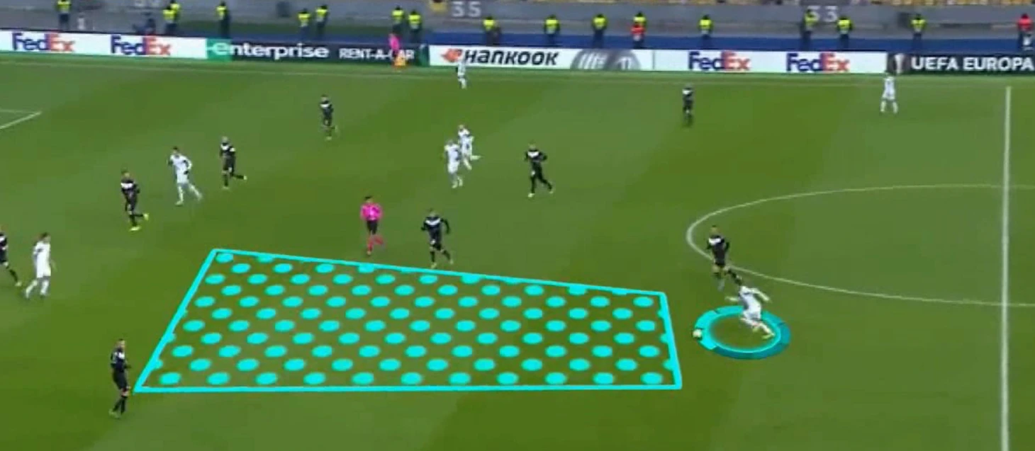 Мы видим, что интеллект футболиста можно оценить не только по эпизодам, когда он с мячом. Очень показательный эпизод: игрок располагается по отношению к партнерам так, что сохраняет игровое расстояние для качественного продвижения мяча.