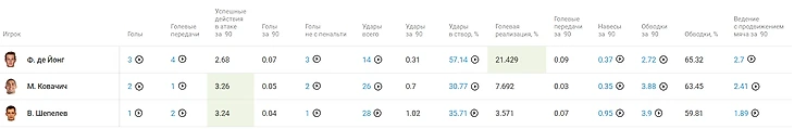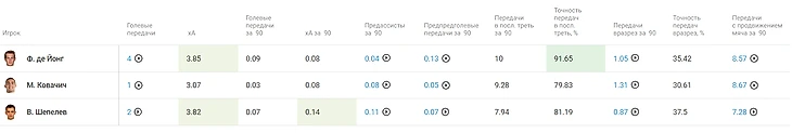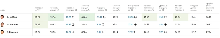 В этих показателях они опять же уступают первой группе игроков, но не существенно. Но мы должны понимать, что они продвигают мяч не только передачами, но и ведением. Обратите внимание, как качественно Де Йонг выполняет передачи в последнюю треть по сравнению с Ковачичем и Шепелевым, но тут мы должны понимать, что соперники «Барселоны» прижимаются к своим воротам, так что длина этих передач небольшая.